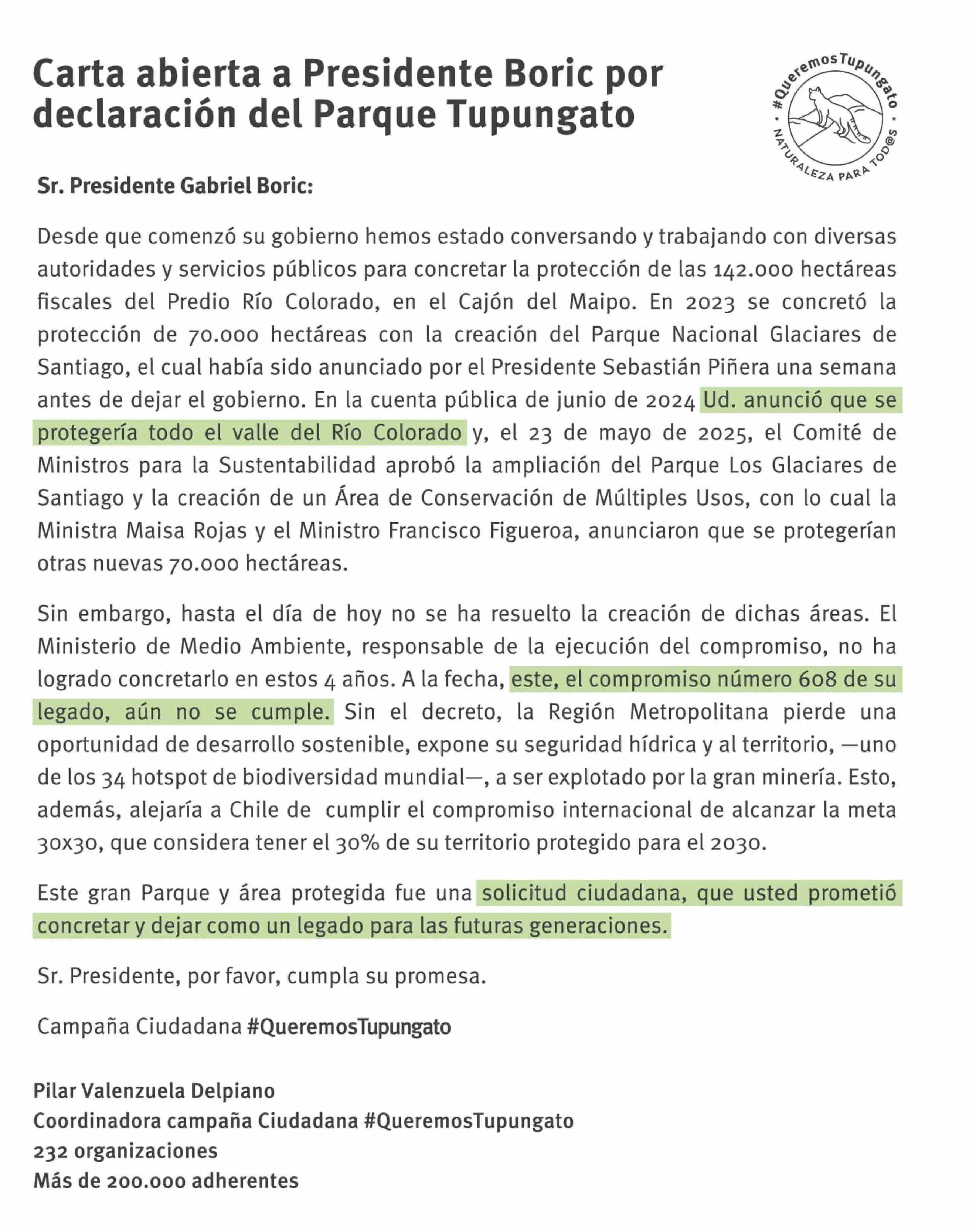 Extractos: Carta abierta a Presidente Boric por declaración del Parque Tupungato