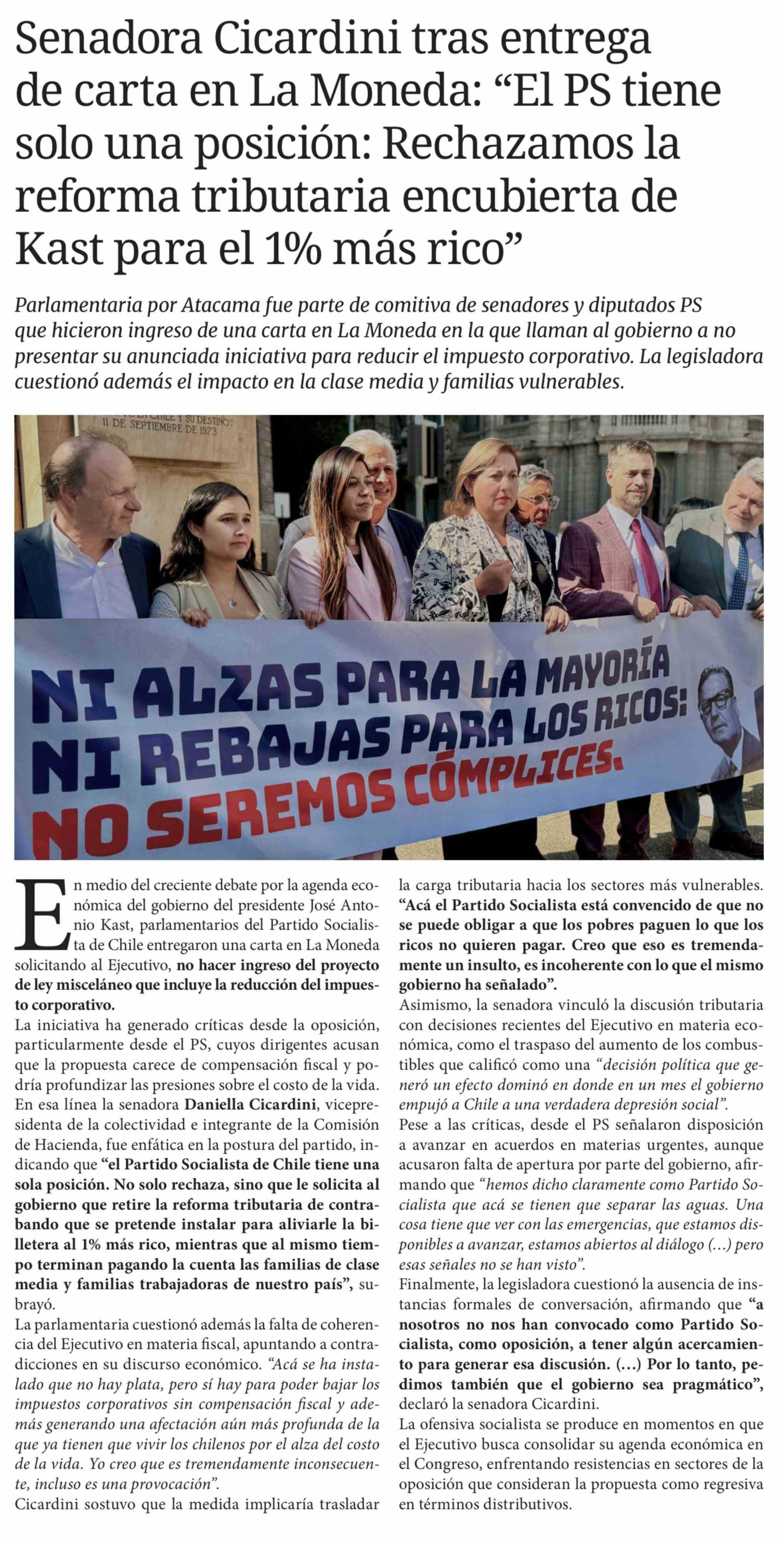 | Título: | Senadora Cicardini tras entrega de carta en La Moneda: "El PS tiene solo una posición: Rechazamos la reforma tributaria encubierta de Kast para el 1% más rico" |