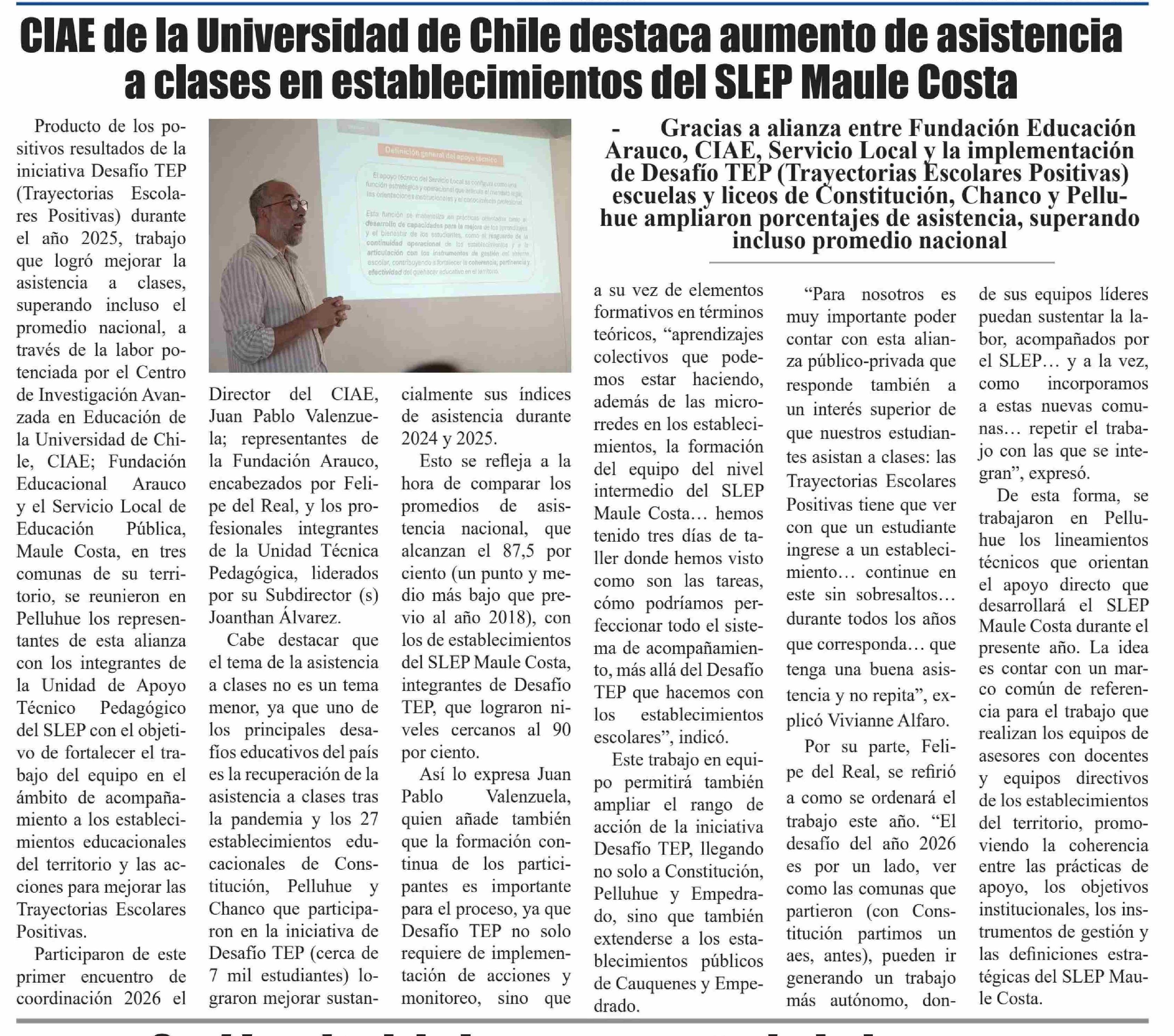 CIAE de la Universidad de Chile destaca aumento de asistencia a clases en establecimientos del SLEP Maule Costa