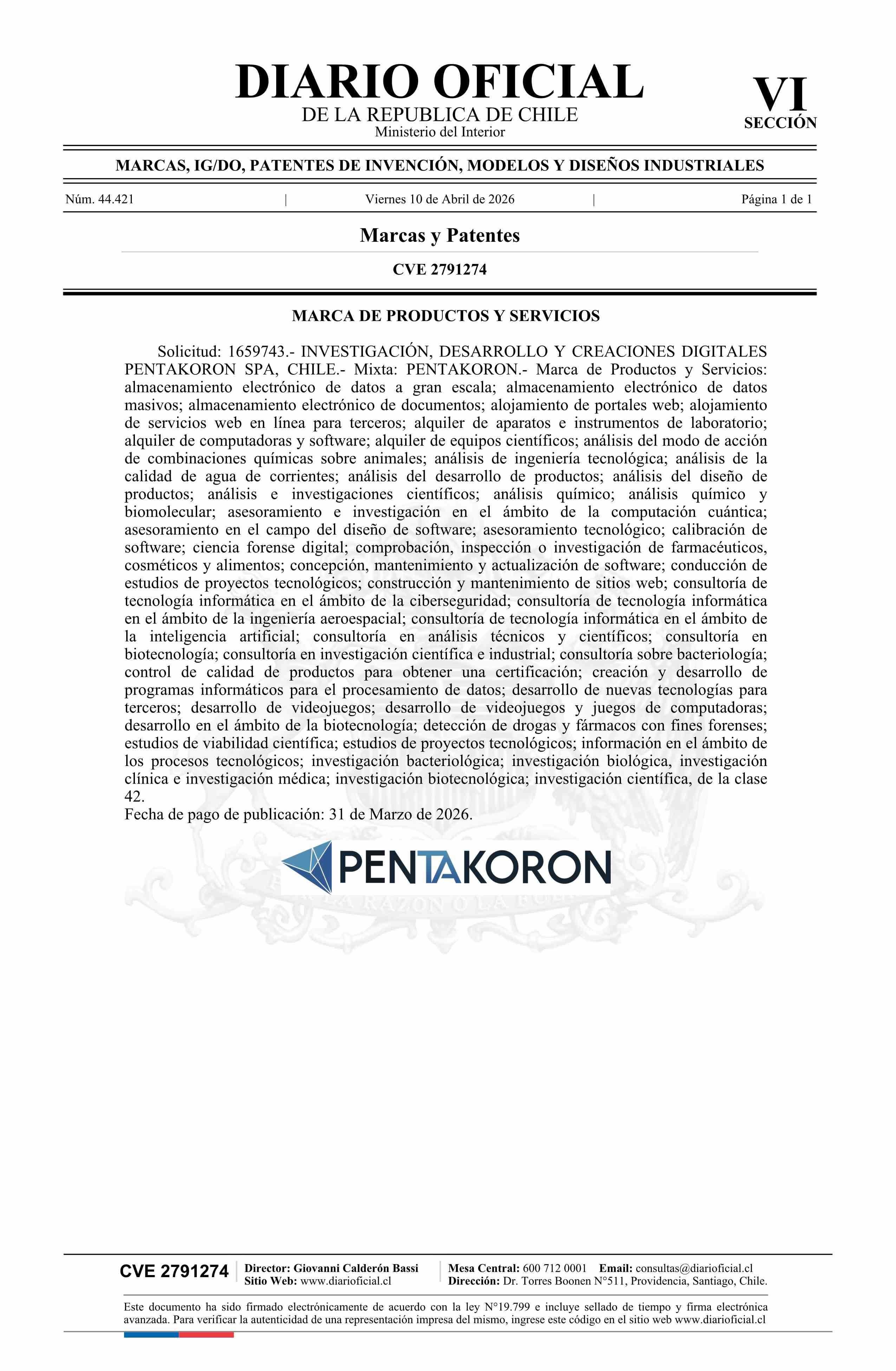 Diario Oficial Edición Electrónica (Diario Oficial de Chile - 6 Marcas Y Patentes)
