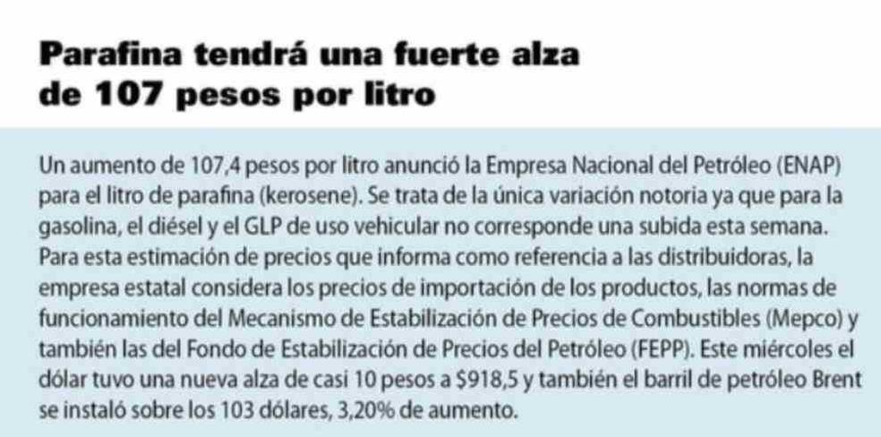 | Título: | Parafina tendrá una fuerte alza de 107 pesos por litro Un aumento de 107,4 pesos por litro anunció la Empresa Nacional del Petróleo (ENAP) para el litro de parafina (kerosene). Se trata de la única variación notoria ya que para la gasolina, el diésel y el GLP de uso vehicular no corresponde una subi |