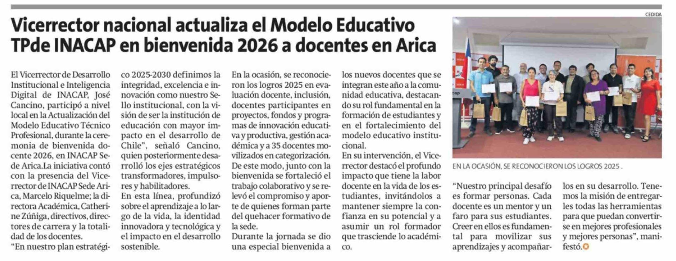 Vicerrector nacional actualiza el Modelo Educativo TPde INACAP en bienvenida 2026 a docentes en Arica