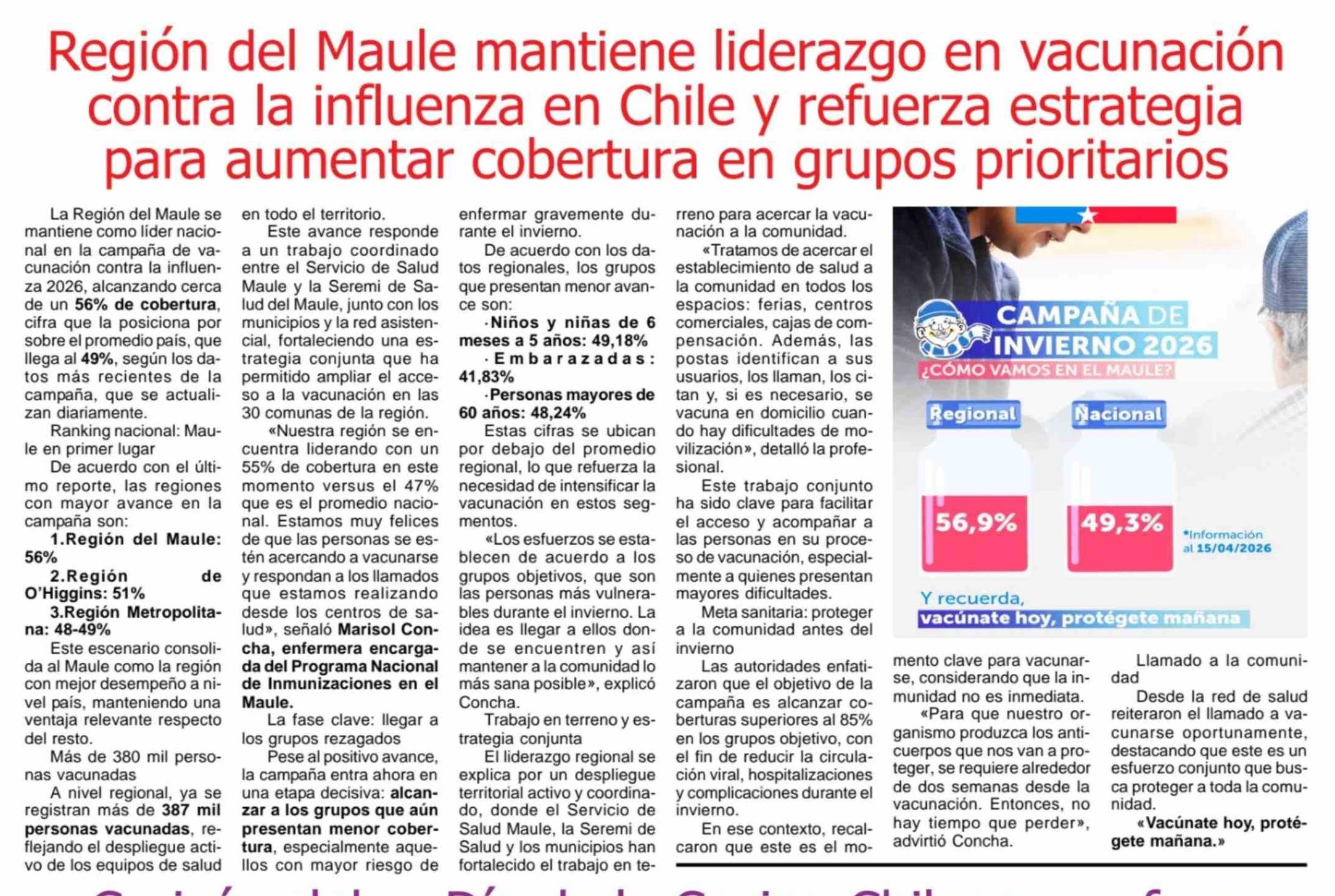 Región del Maule mantiene liderazgo en vacunación contra la influenza en Chile y refuerza estrategia para aumentar cobertura en grupos prioritarios