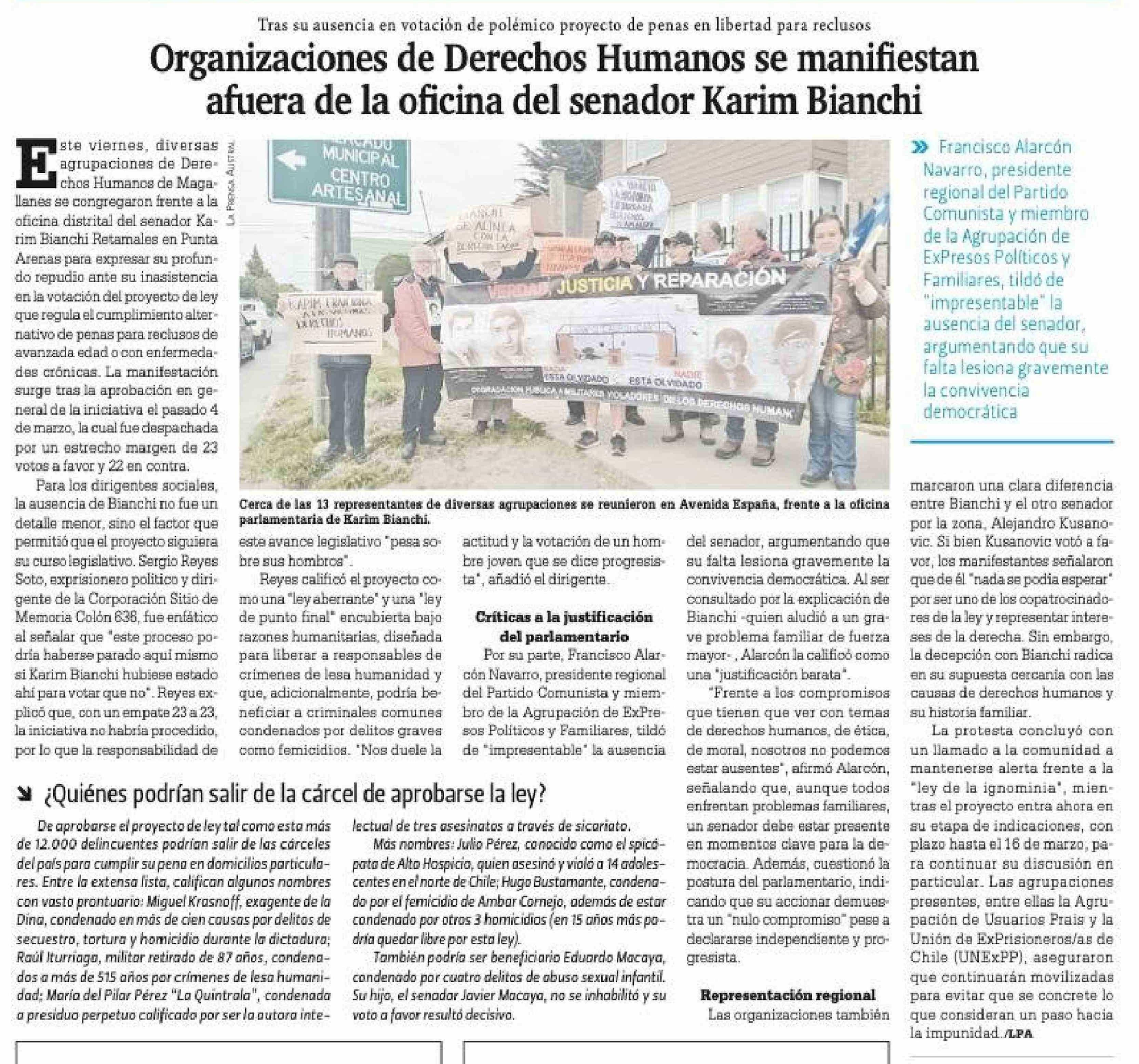 Organizaciones de Derechos Humanos se manifiestan afuera de la oficina del senador Karim Bianchi
