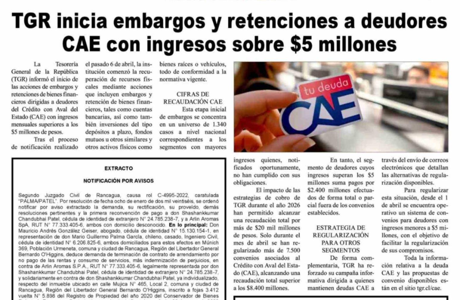 TGR inicia embargos y retenciones a deudores CAE con ingresos sobre $5 millones
