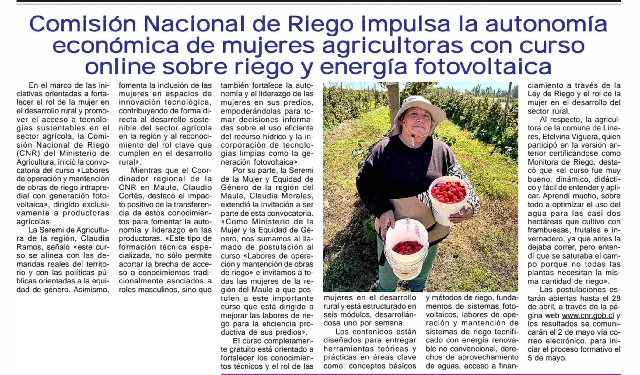 Comisión Nacional de Riego impulsa la autonomía económica de mujeres agricultoras con curso online sobre riego y energía fotovoltaica