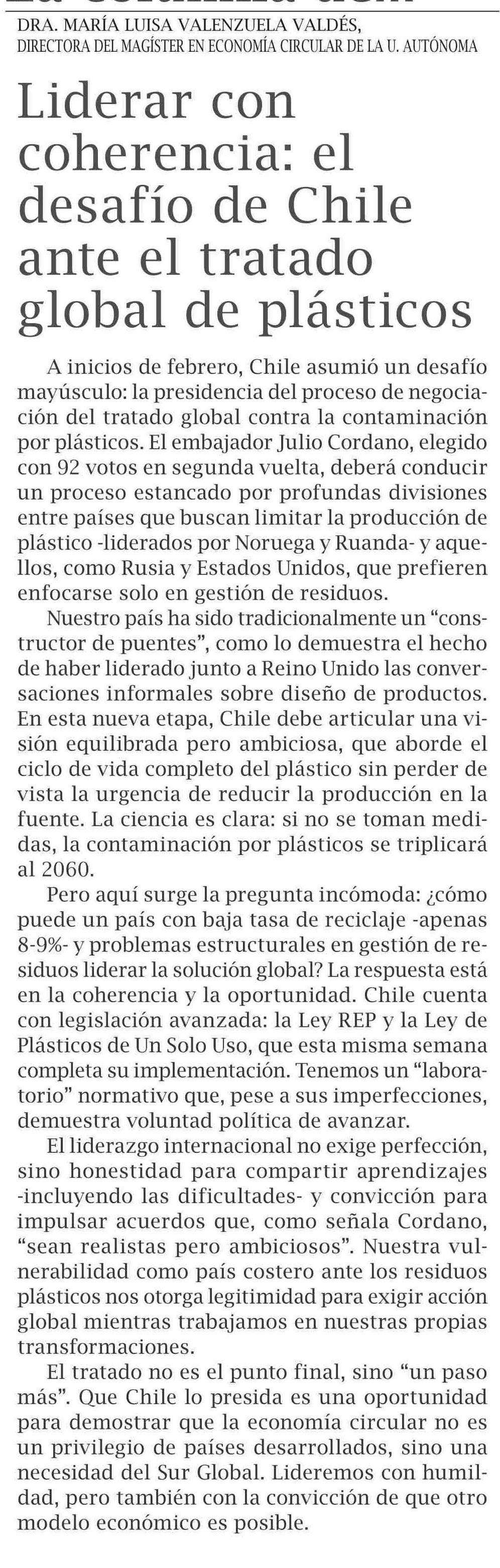 Columnas de Opinión: Liderar con coherencia: el desafío de Chile ante el tratado global de plásticos