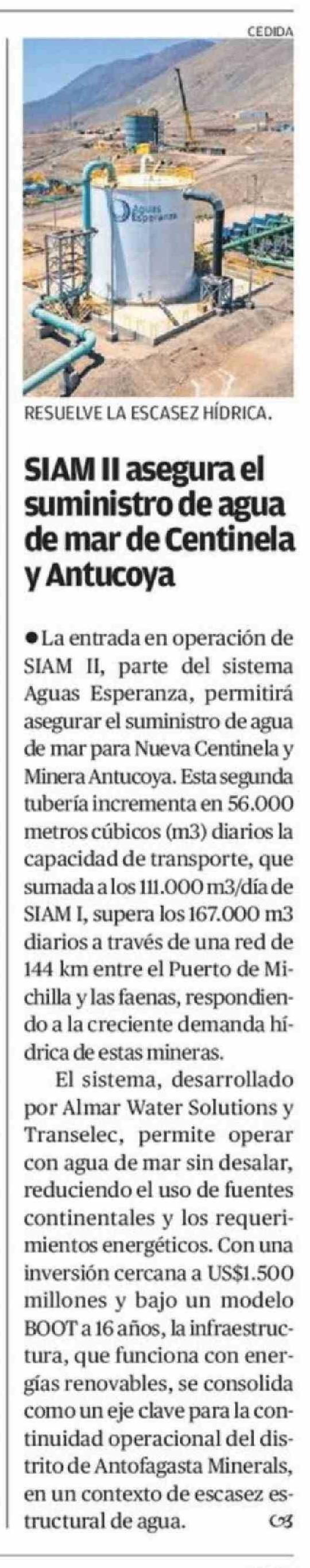 SIAM II asegura el suministro de agua de mar de Centinela y Antucoya