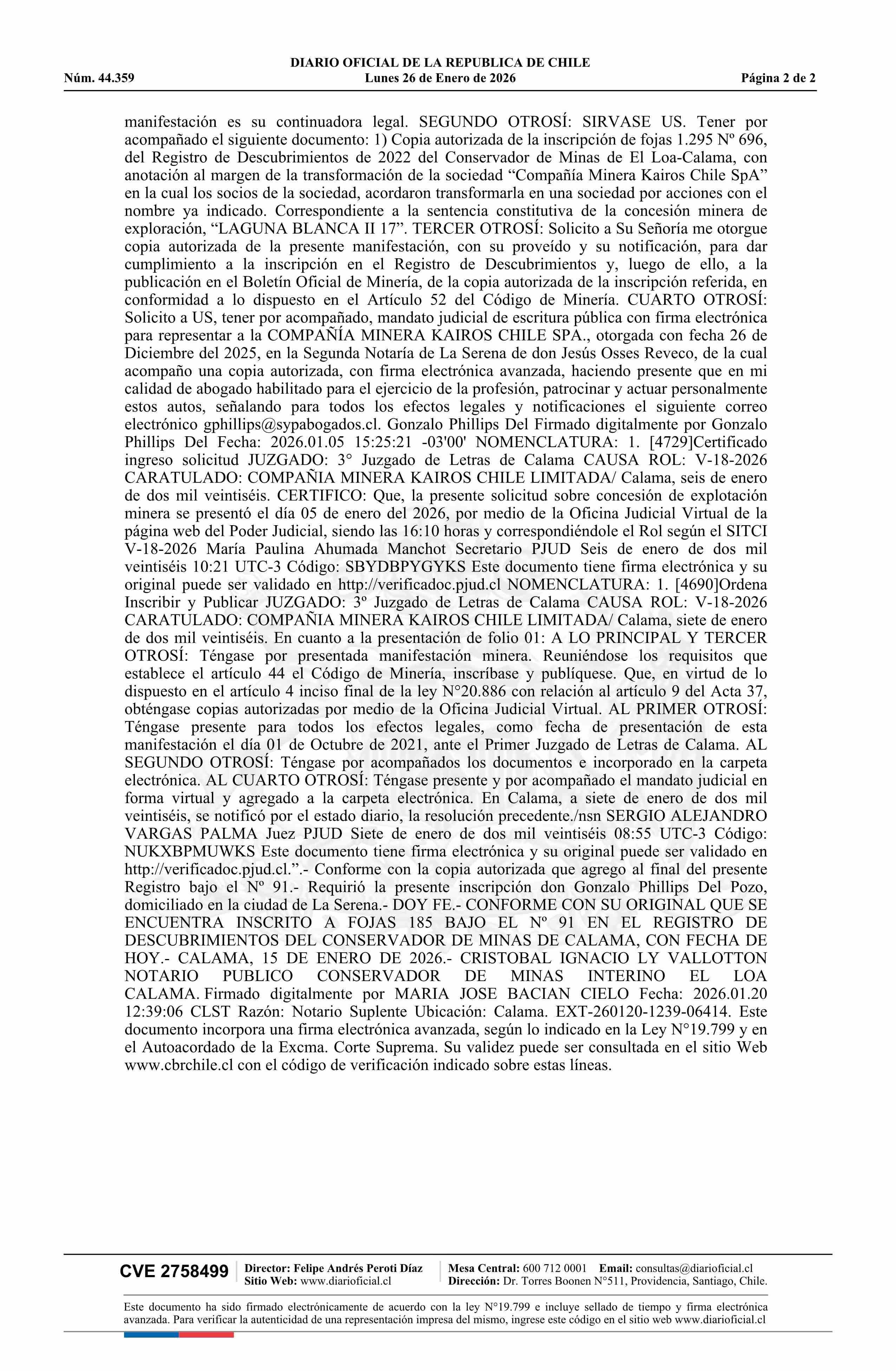 LAGUNA BLANCA II 17, 1 AL 30 / Compañía Minera Kairos Chile SpA