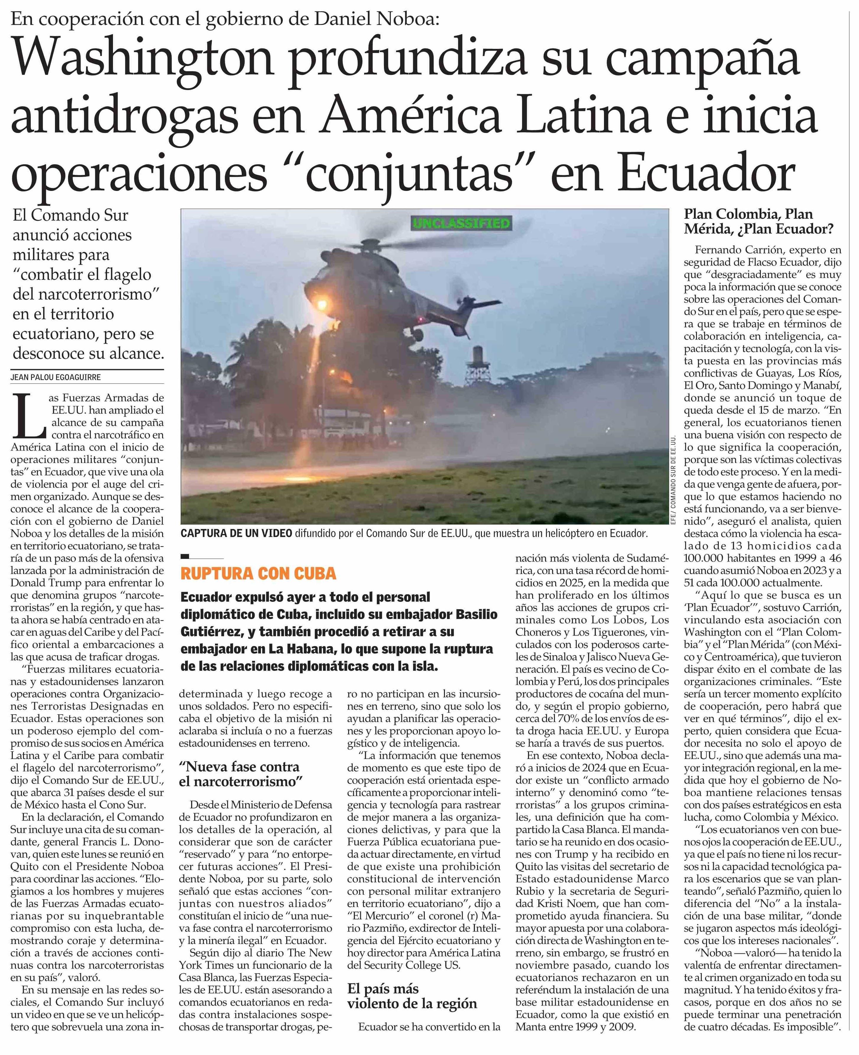 Washington profundiza su campaña antidrogas en América Latina e inicia operaciones “conjuntas” en Ecuador