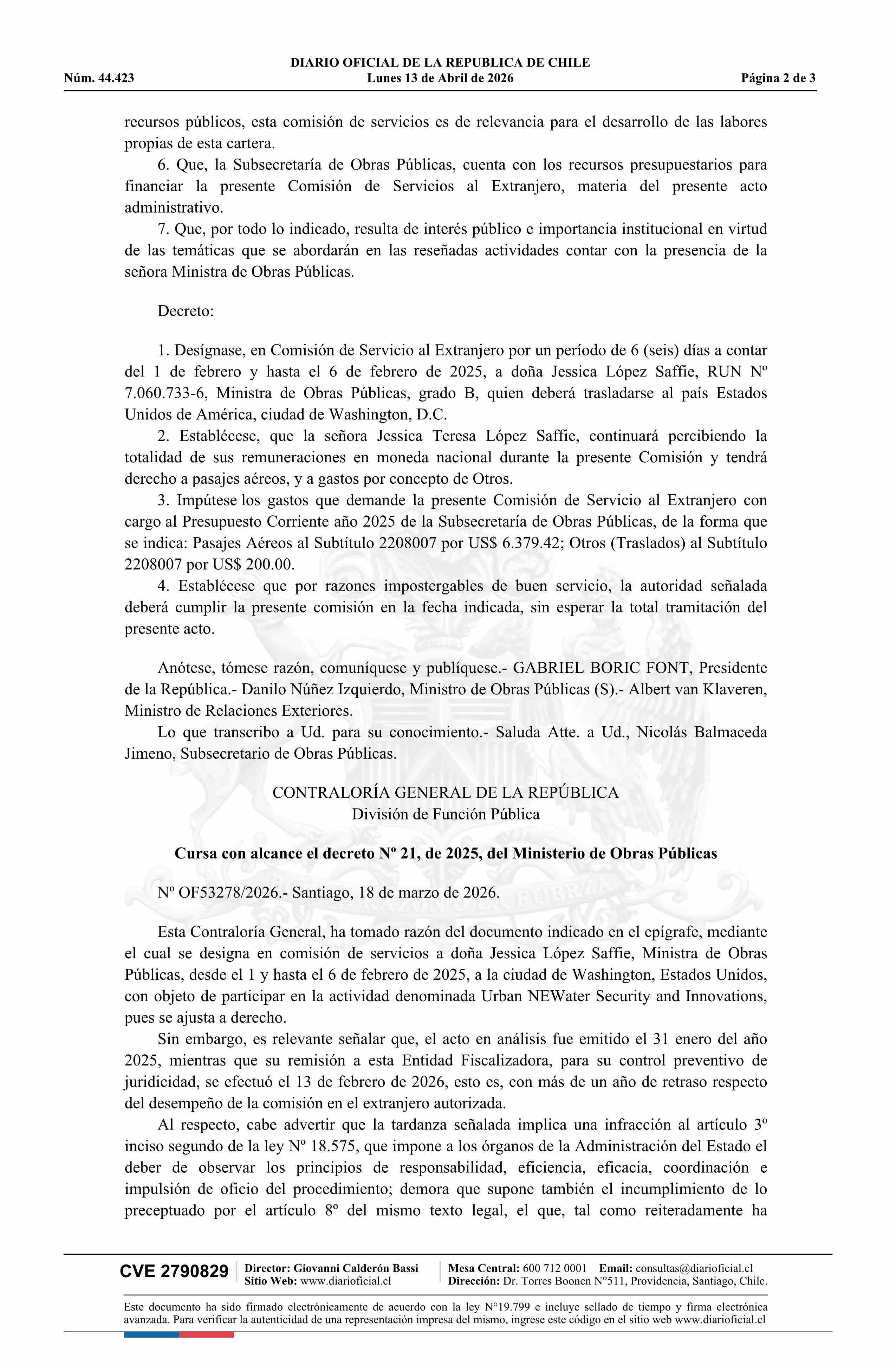 | Título: | Decreto número 21, de 2025.- Designa en comisión de servicio al extranjero a doña Jessica López Saffie, Ministra de Obras Públicas, a la ciudad de Washington, Estados Unidos de América |