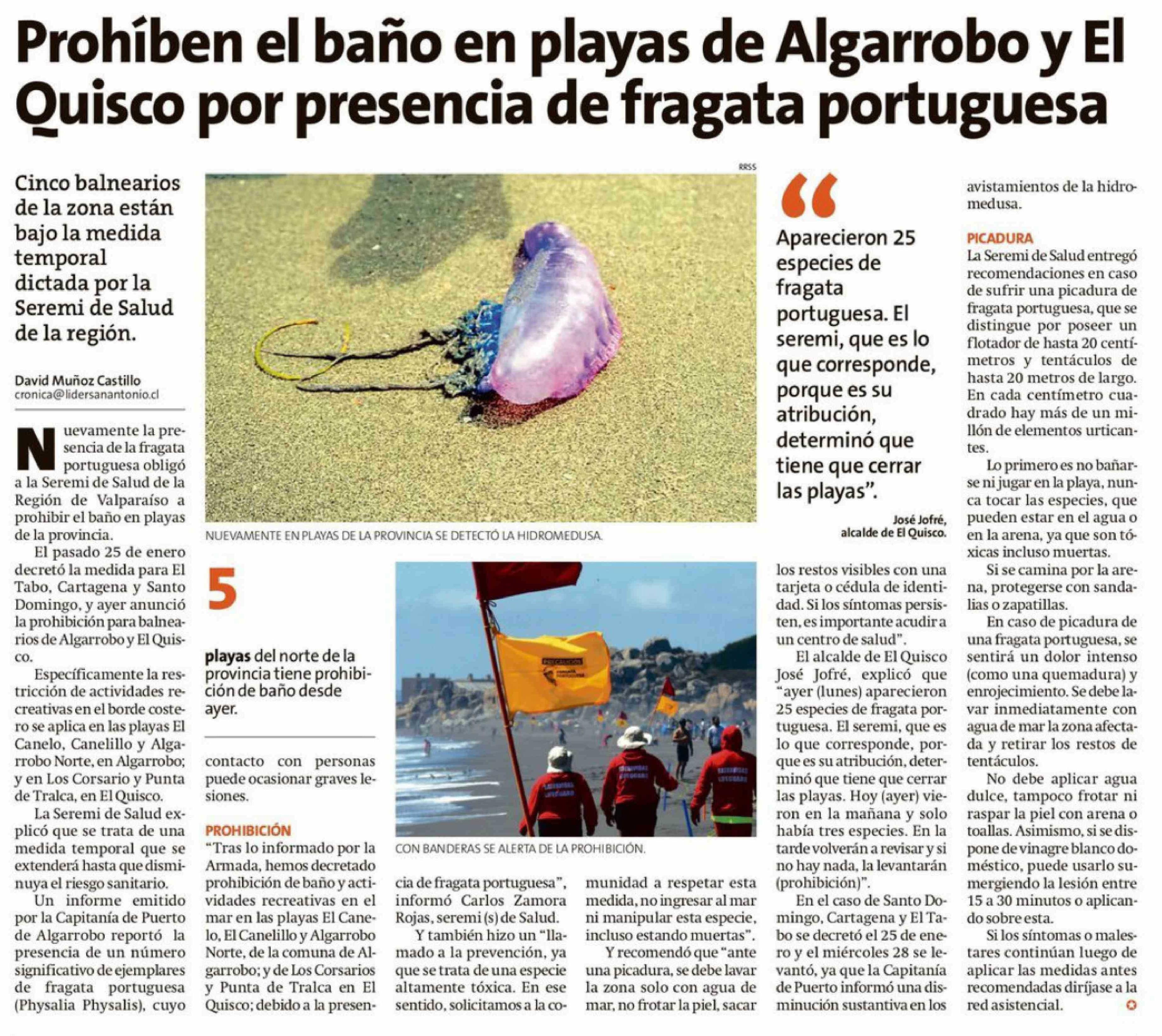 Prohíben el baño en playas de Algarrobo y El Quisco por presencia de fragata portuguesa