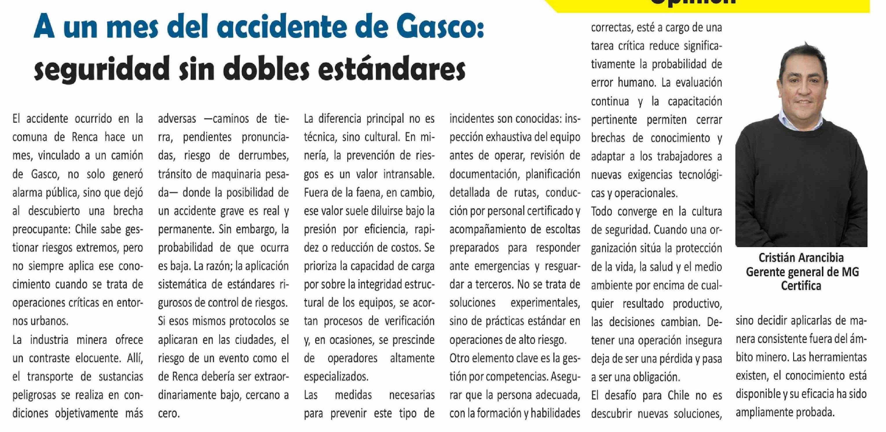 Título: Columnas de Opinión: A un mes del accidente de Gasco: seguridad sin dobles estándares