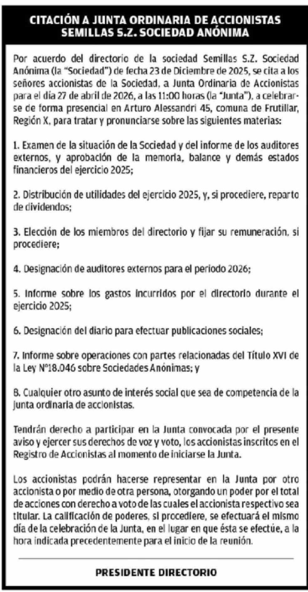 Extractos: CITACIÓN A JUNTA ORDINARIA DE ACCIONISTAS SEMILLAS S.Z. SOCIEDAD ANÓNIMA