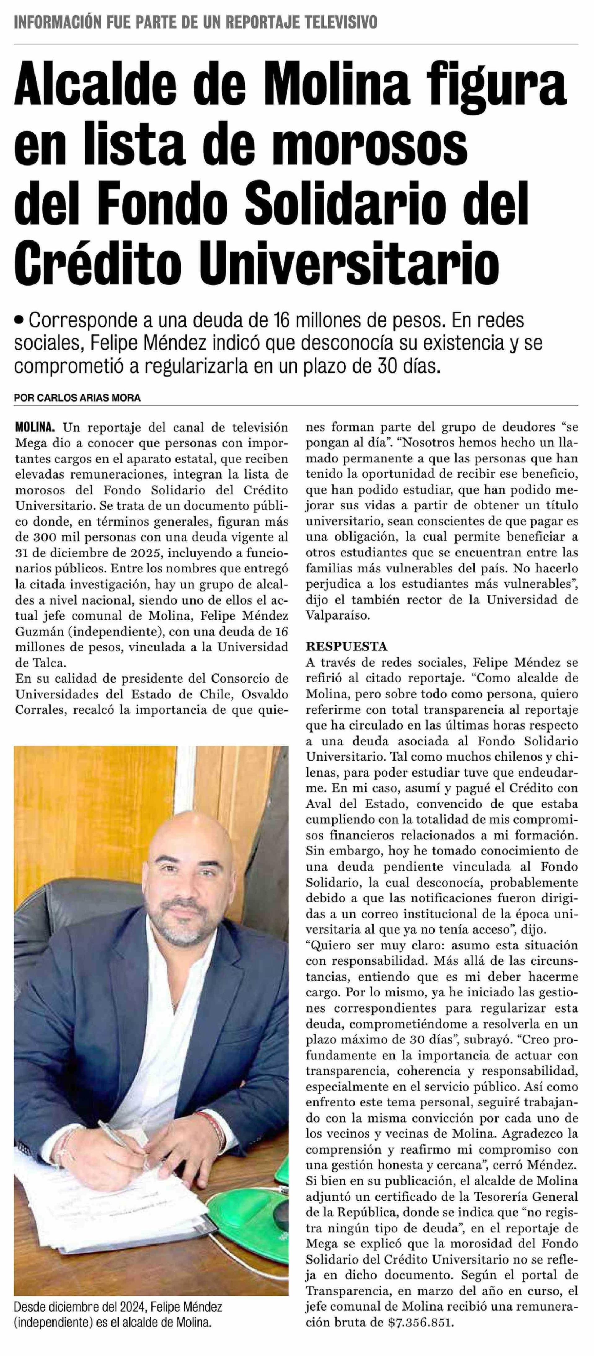Título: Alcalde de Molina figura en lista de morosos del Fondo Solidario del Crédito Universitario