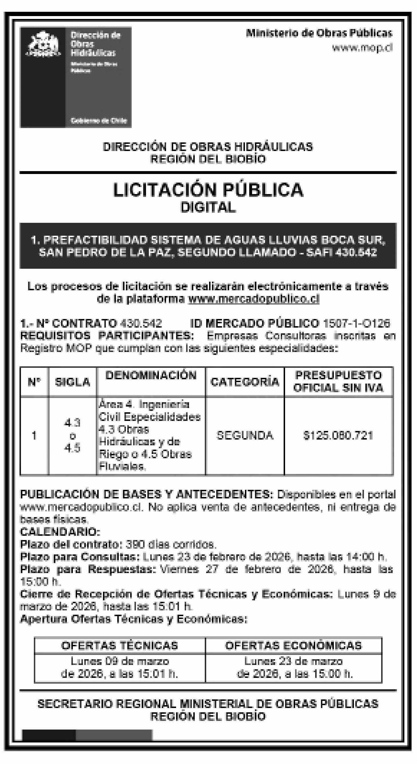 | Título: | AVISO LICITACIONES: PREFACTIBILIIJhD SISTEMA DE AGUAS LLUVIAS BOCA SUP., SAN PEDRO DE LA PAZ. SEGUNDO LLAMADO-SAFI 430.642 - MOP |