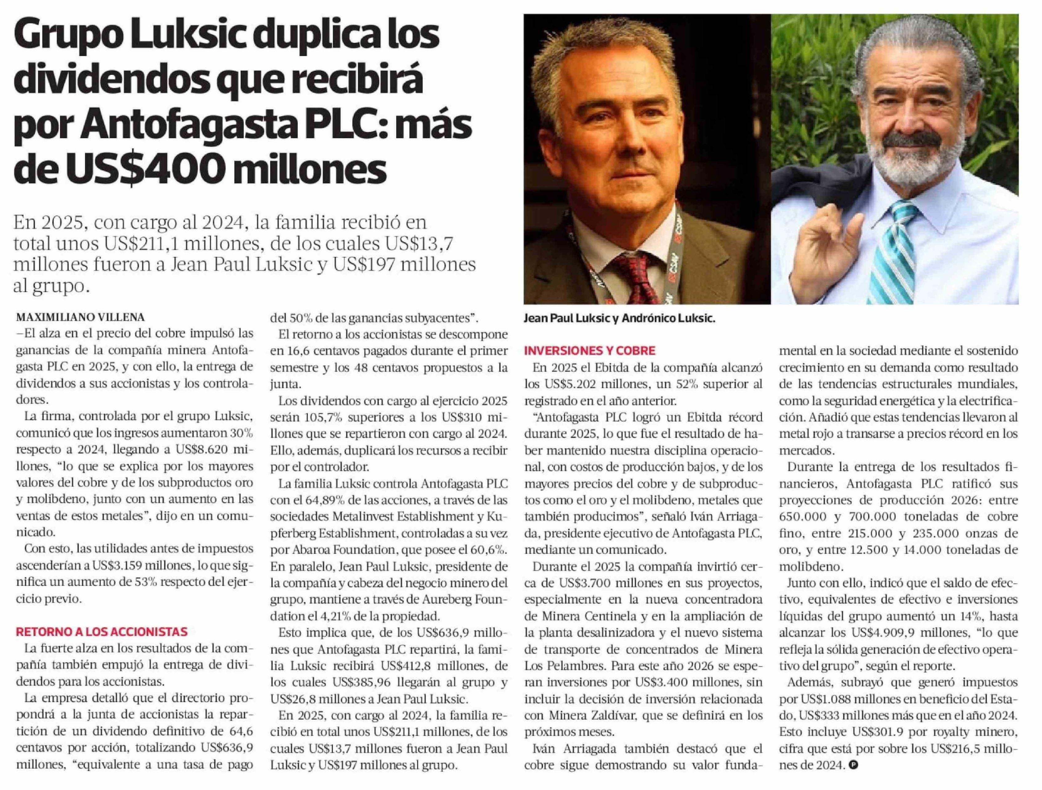Grupo Luksic duplica los dividendos que recibirá por Antofagasta PLC: más de US$400 millones