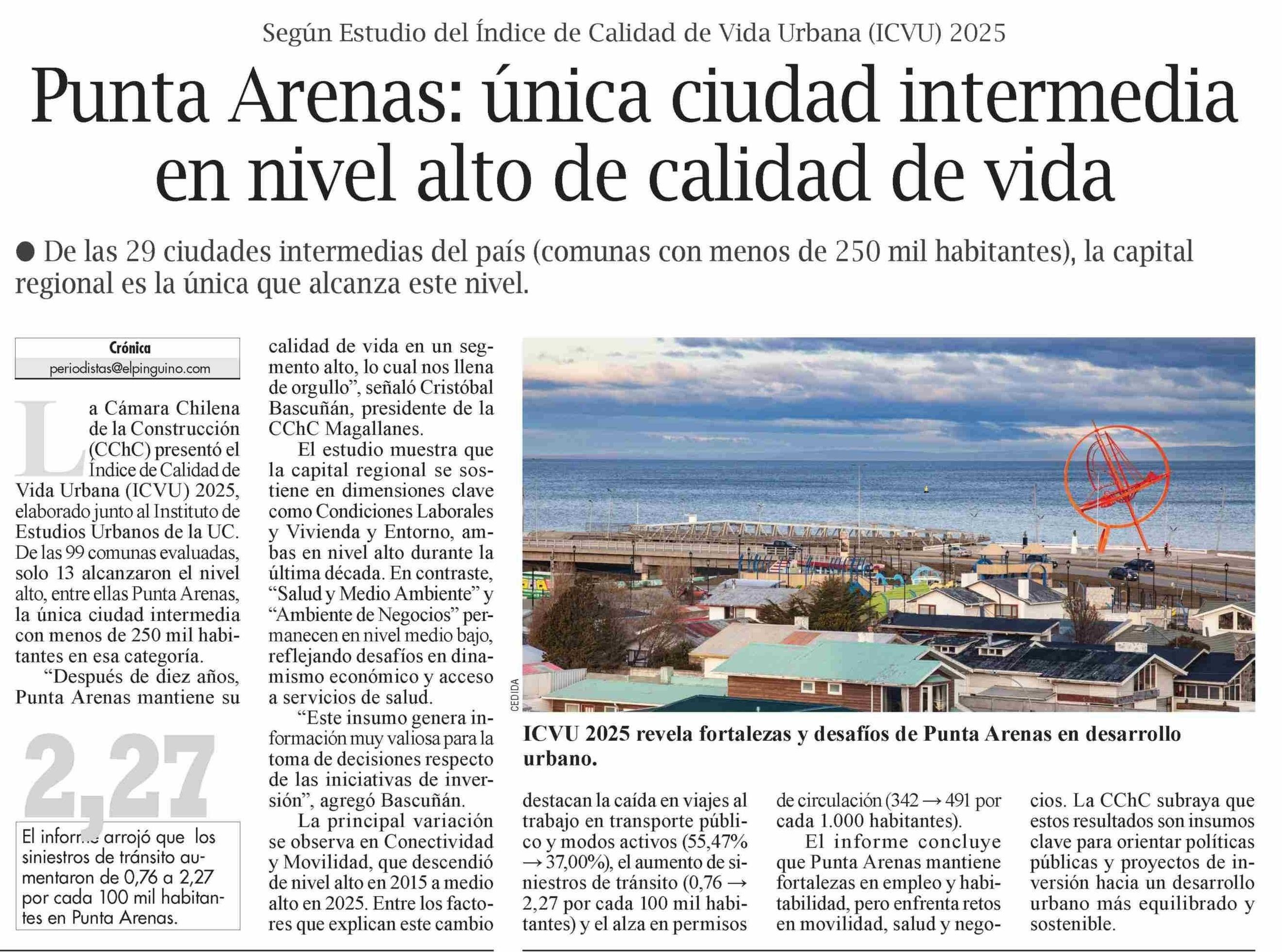 Punta Arenas: única ciudad intermedia en nivel alto de calidad de vida
