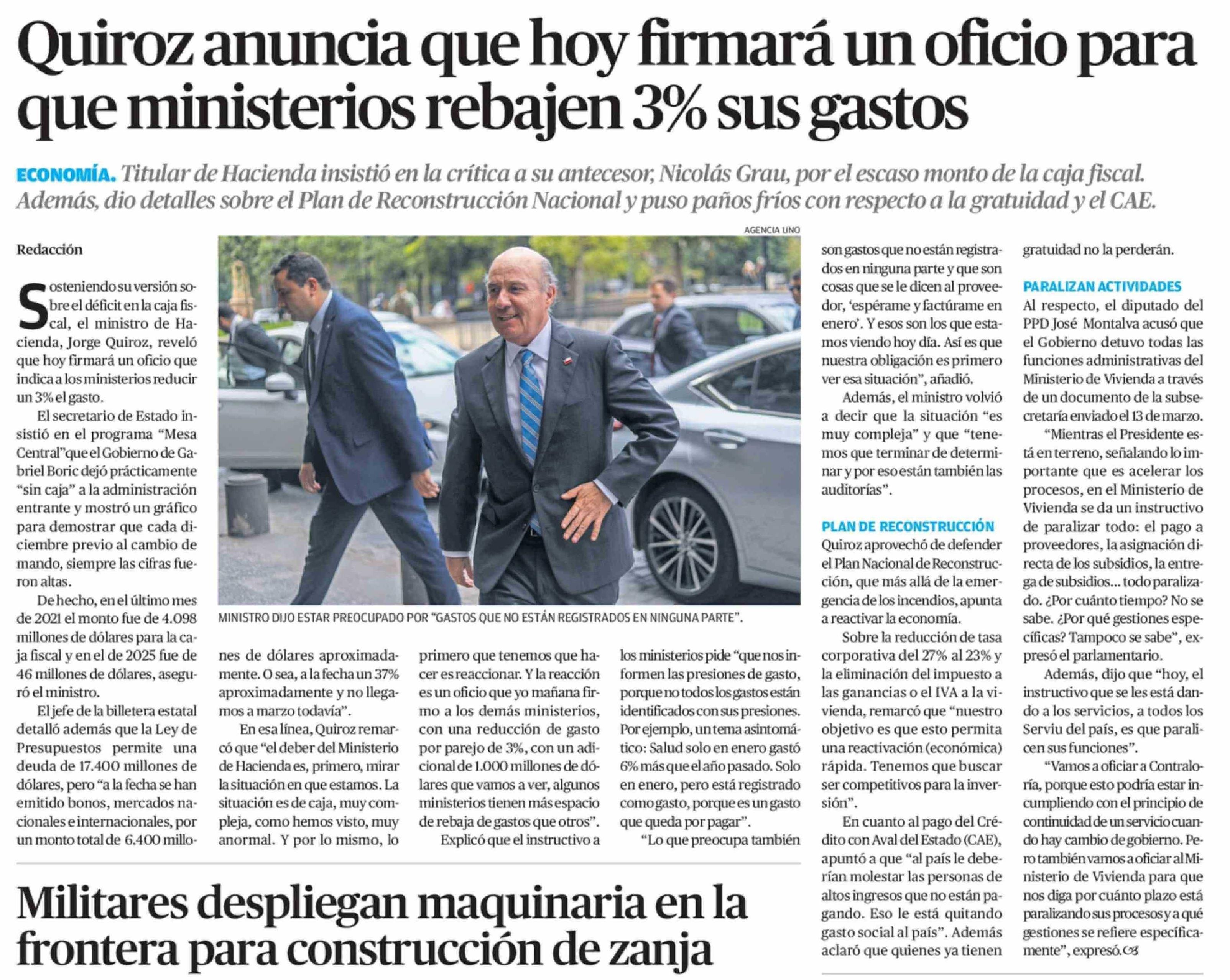 Quiroz anuncia que hoy firmará un oficio para que ministerios rebajen 3% sus gastos