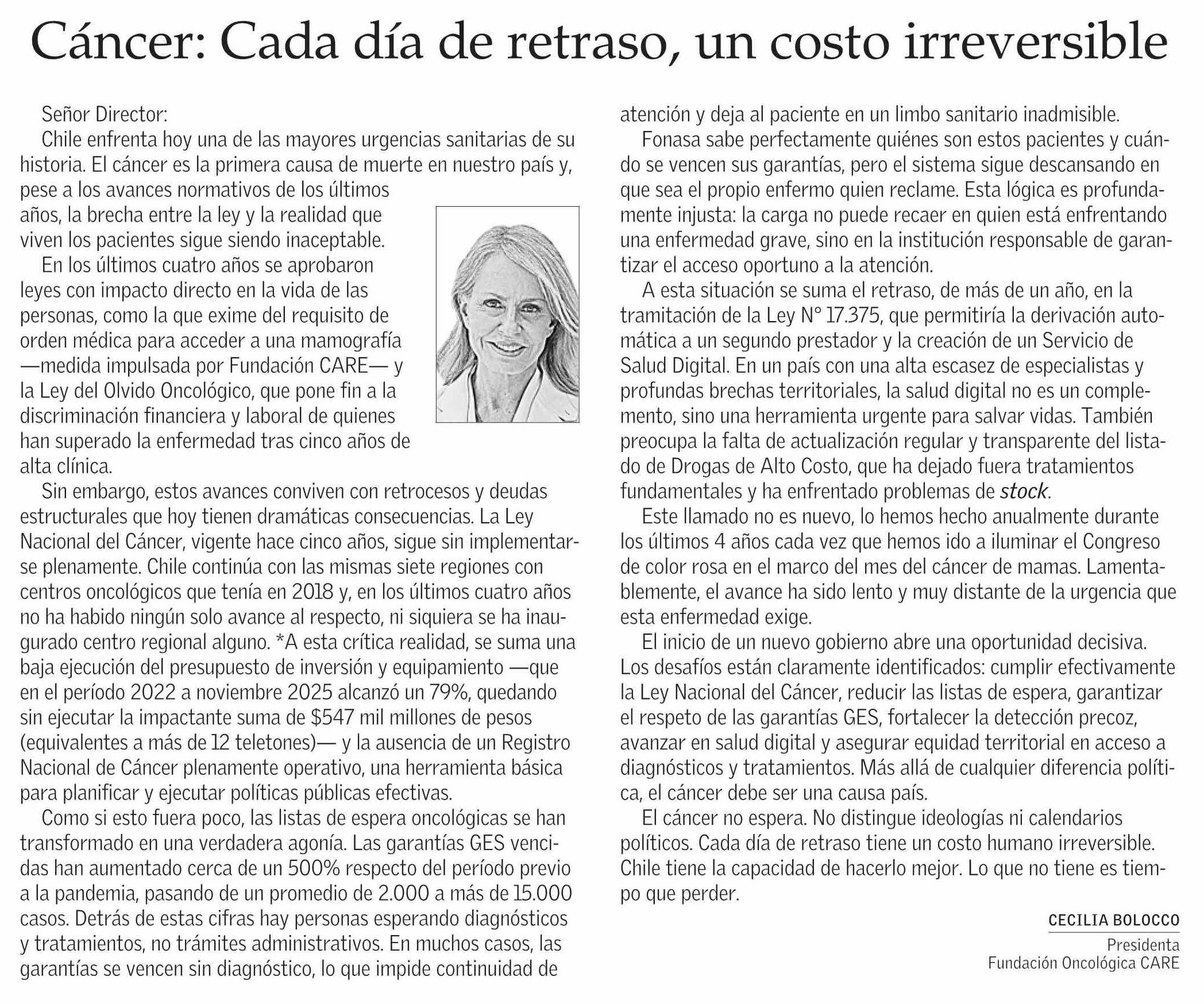 Título: Cartas: Cáncer: Cada día de retraso, un costo irreversible