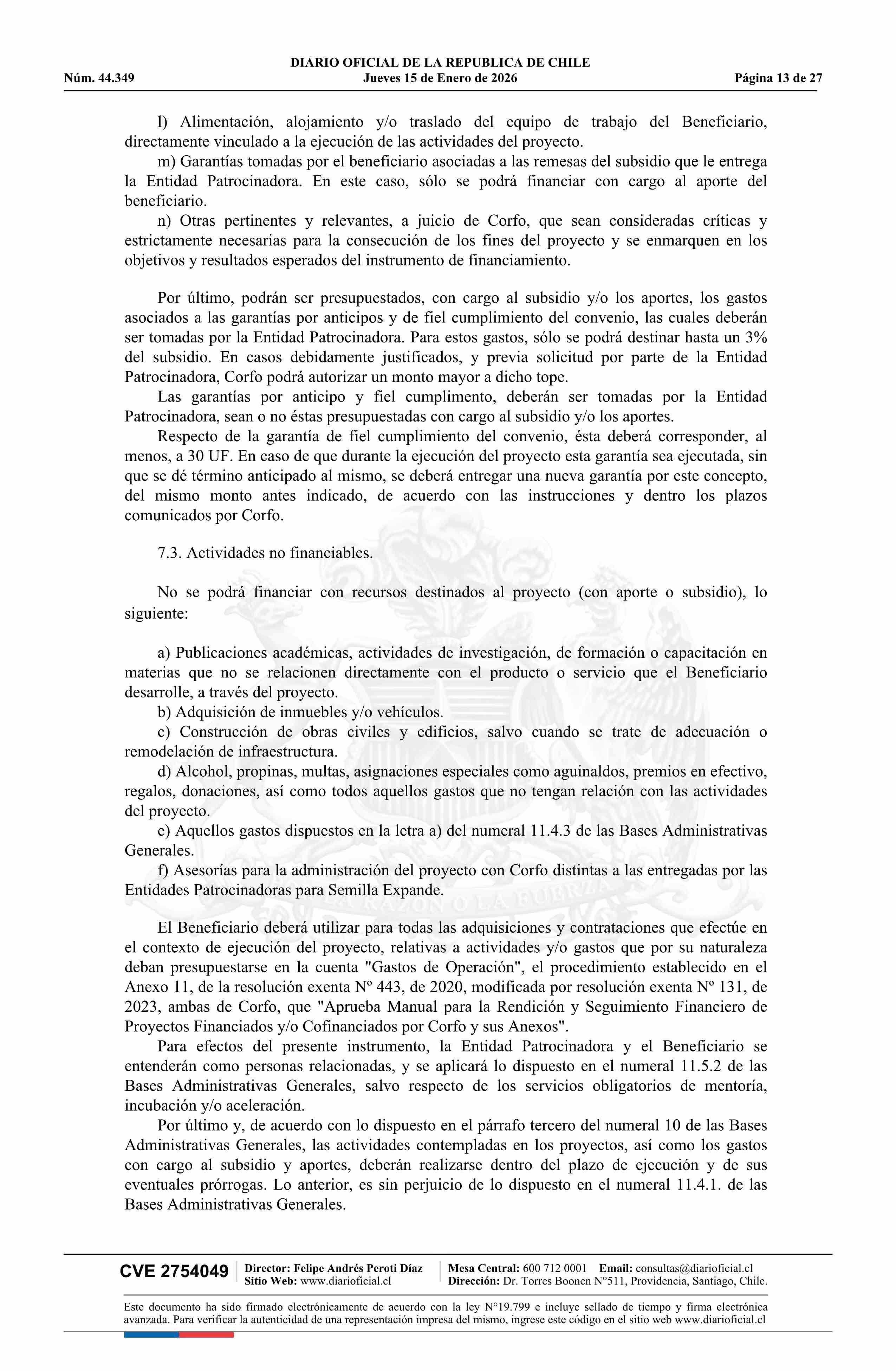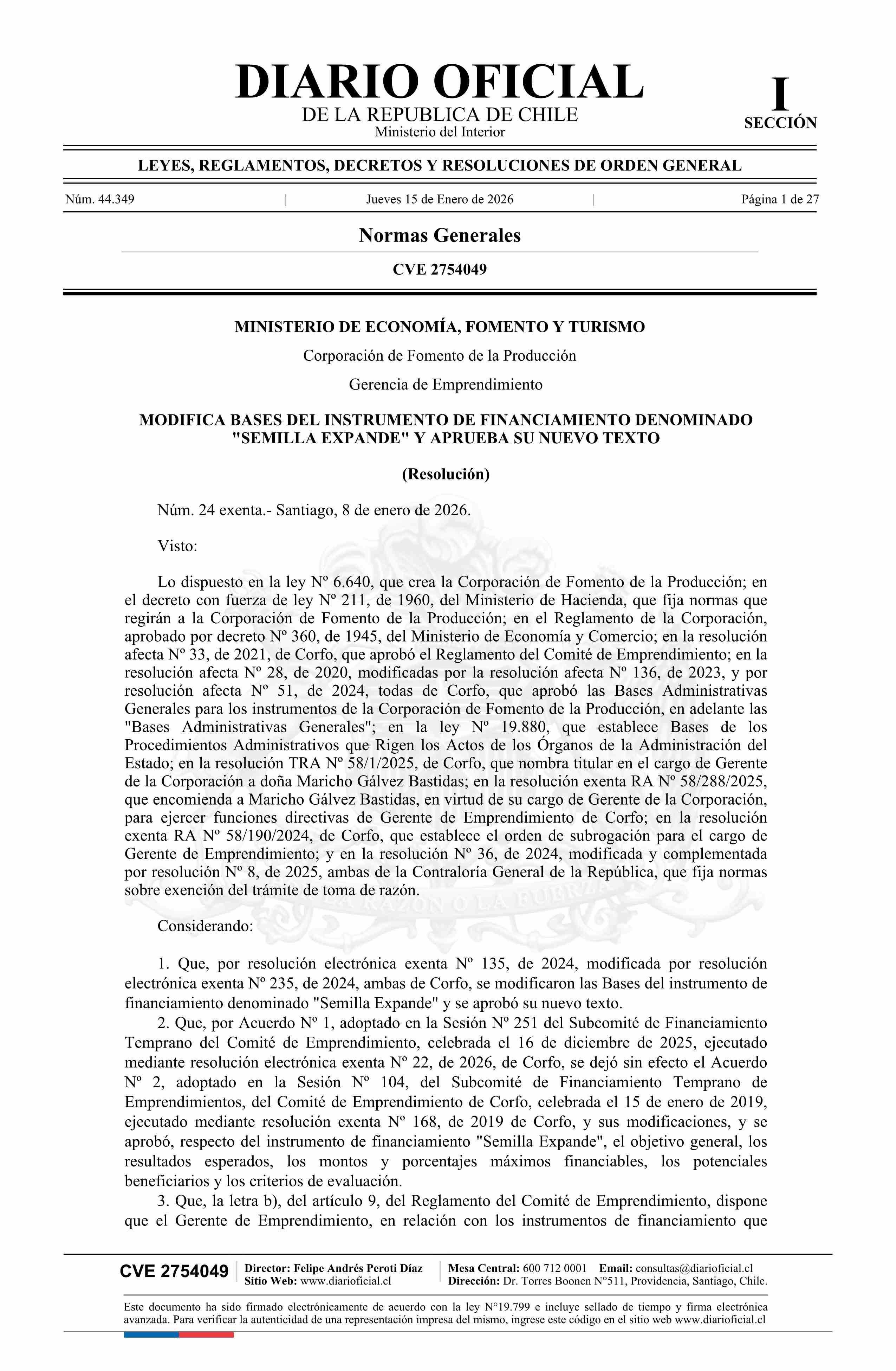 | Título: | Resolución exenta número 24, de 2026.- Modifica bases del instrumento de financiamiento denominado Semilla Expande y aprueba su nuevo texto |