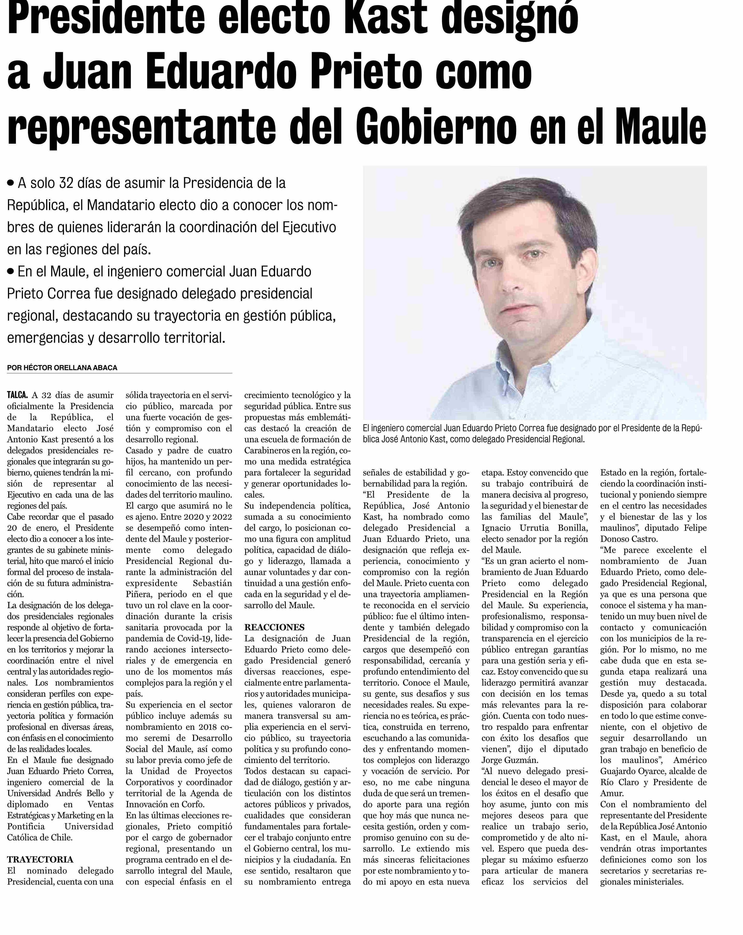 Título: Presidente electo Kast designó a Juan Eduardo Prieto como representante del Gobierno en el Maule