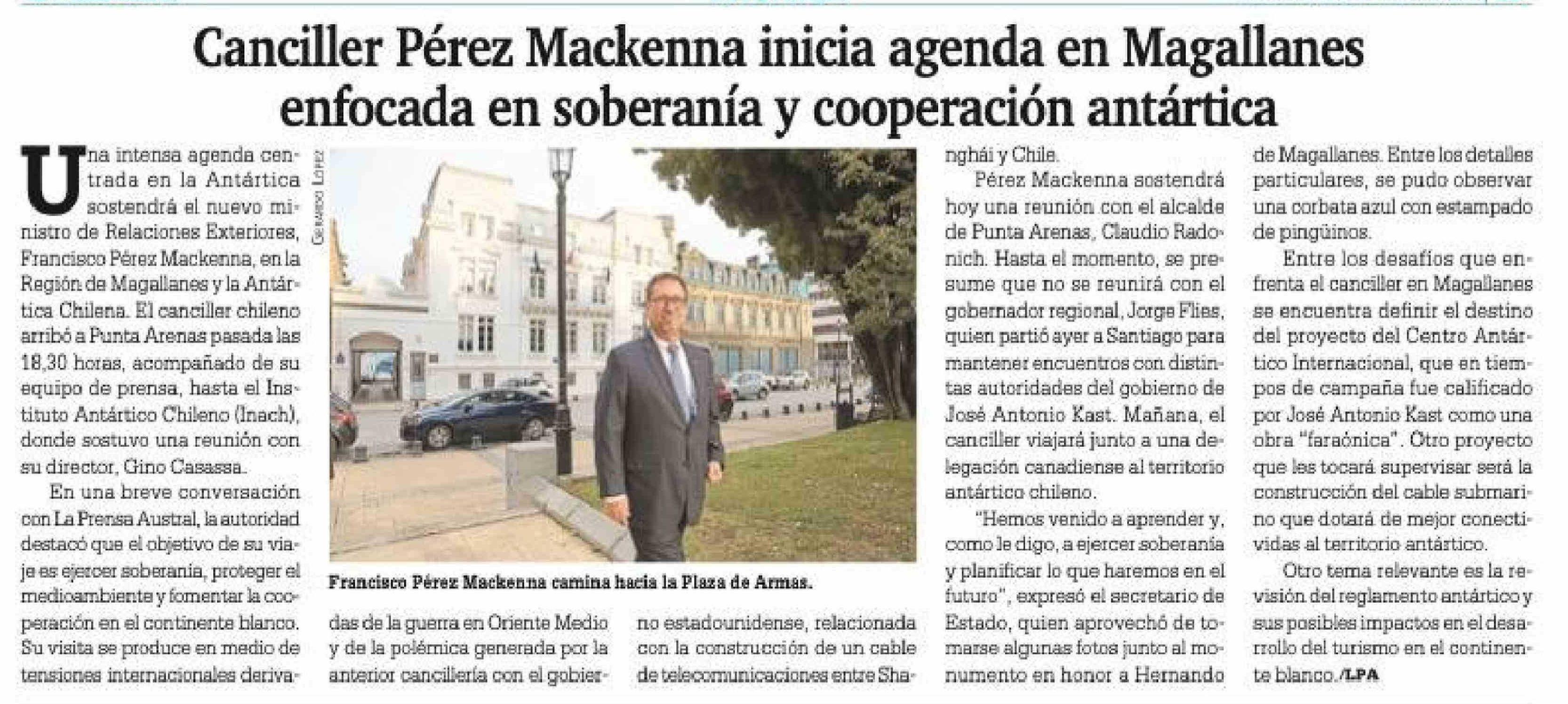 Canciller Pérez Mackenna inicia agenda en Magallanes enfocada en soberanía y cooperación antártica