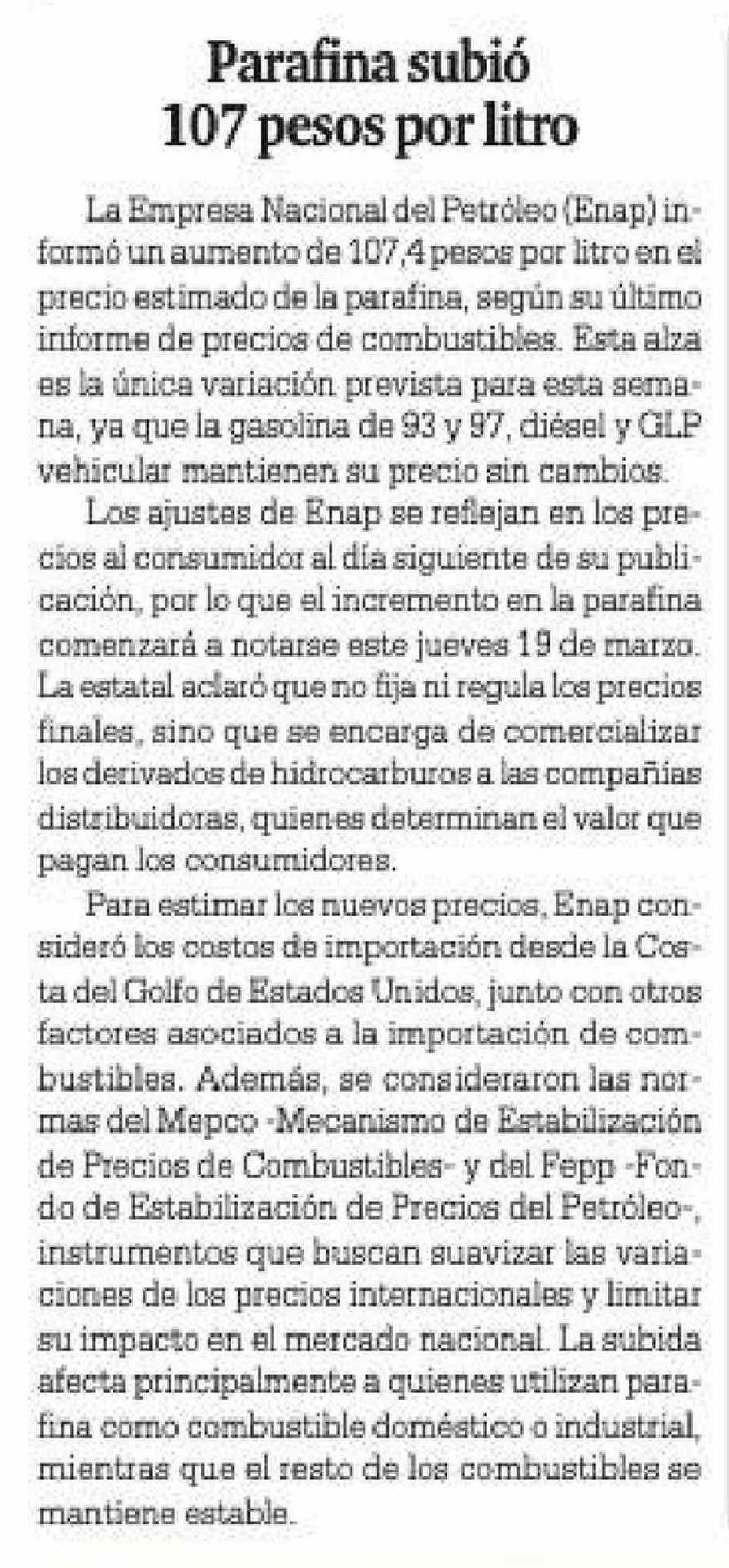 Parafina subió 107 pesos por litro