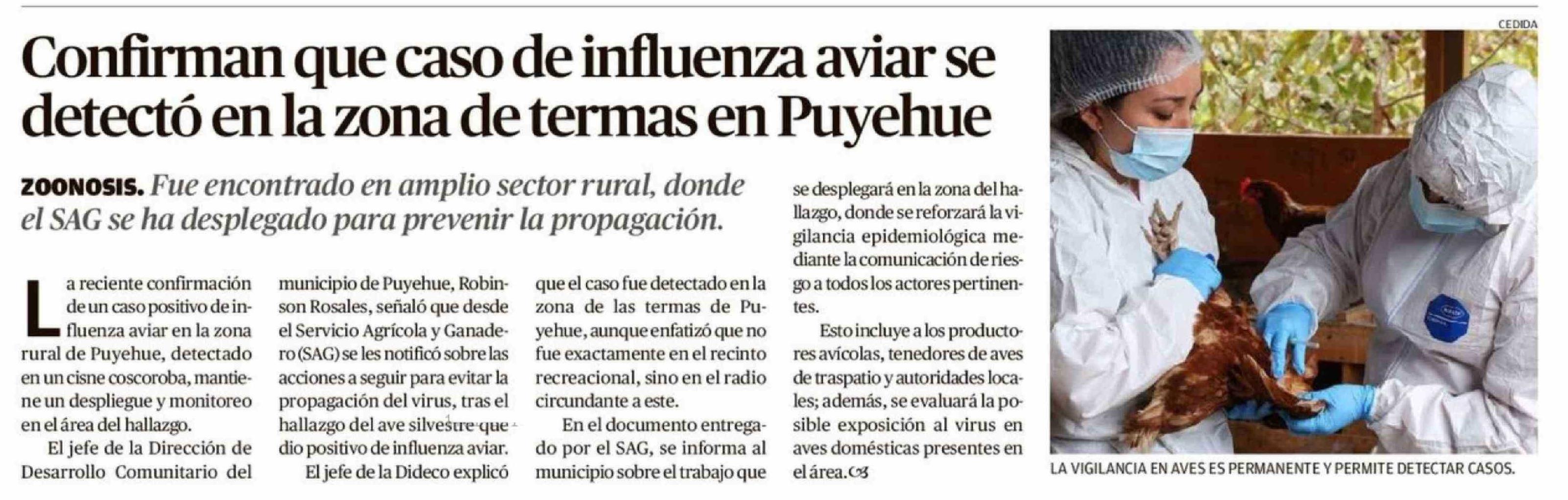 Confirman que caso de influenza aviar se detectó en la zona de termas en Puyehue