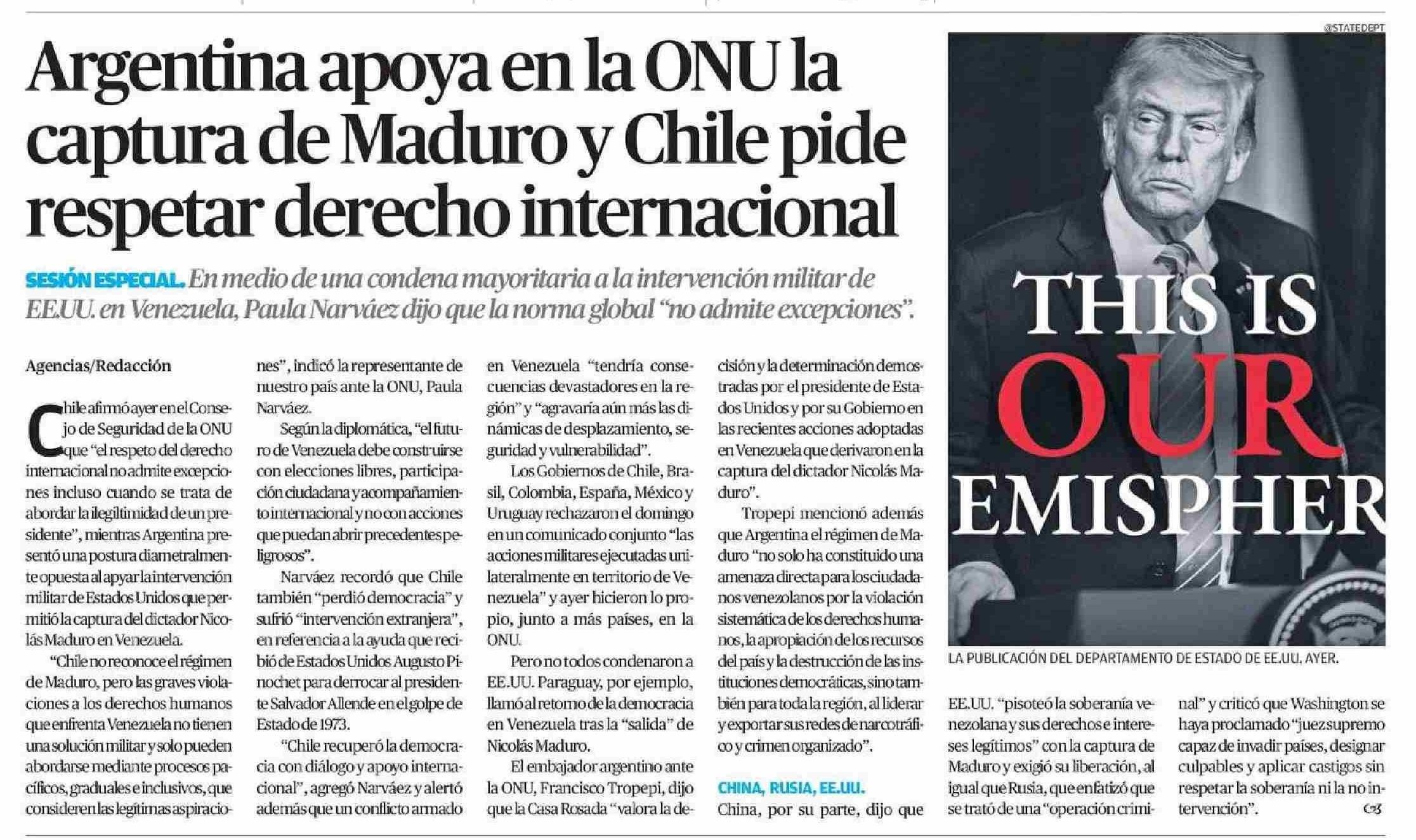 Argentina apoya en la ONU la captura de Maduro y Chile pide respetar derecho internacional
