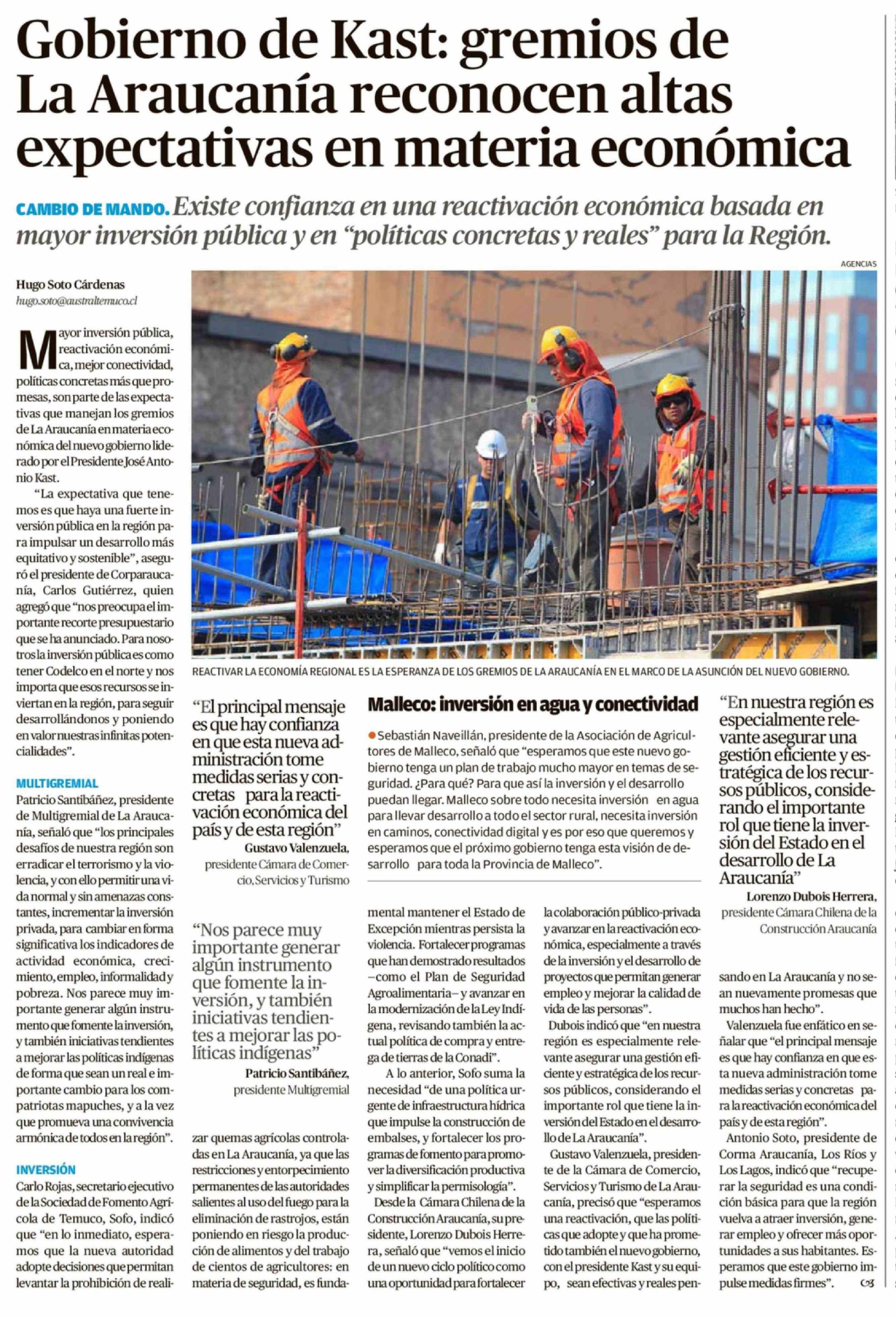 Gobierno de Kast: gremios de La Araucanía reconocen altas expectativas en materia económica