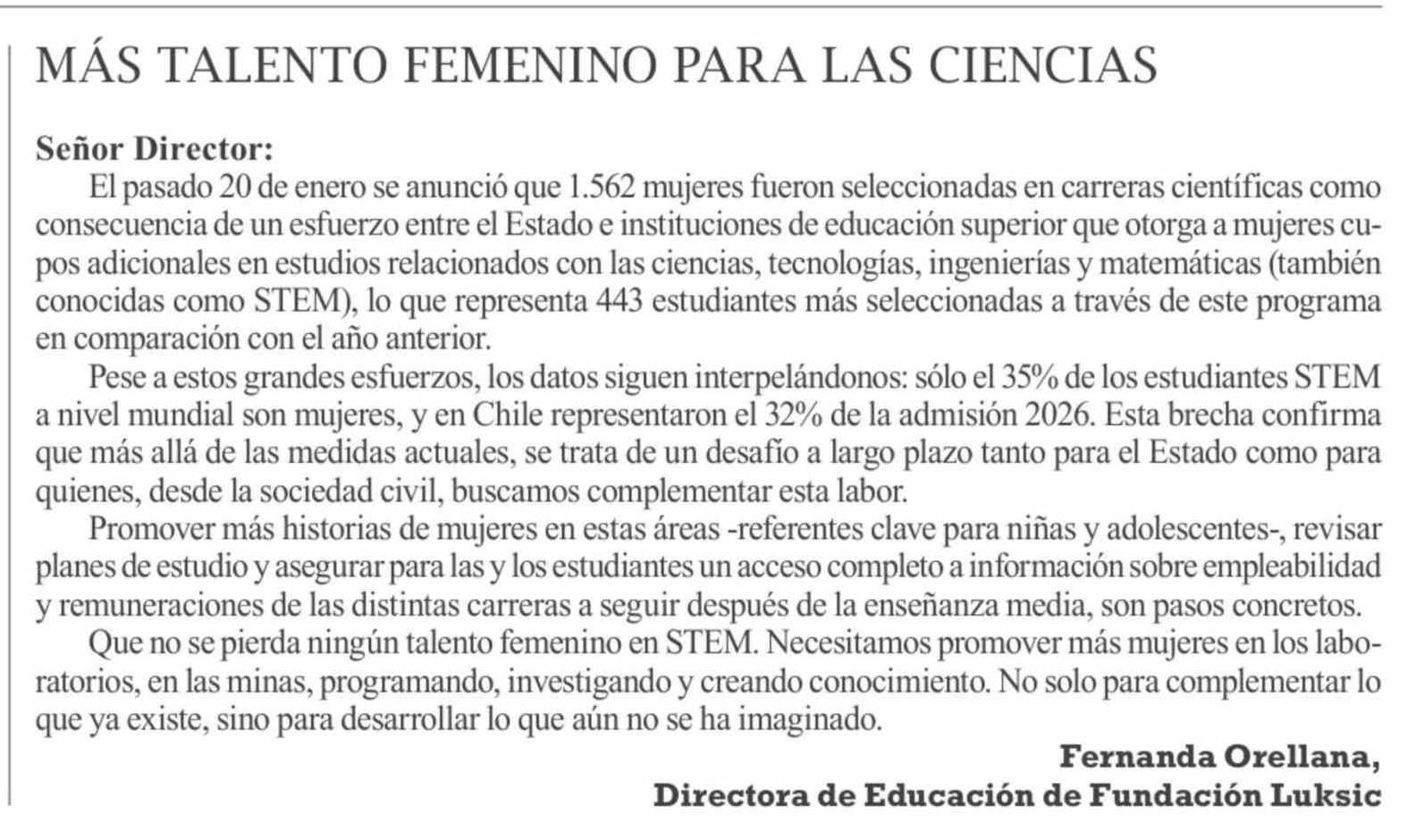 Cartas: MÁS TALENTO FEMENINO PARA LAS CIENCIAS