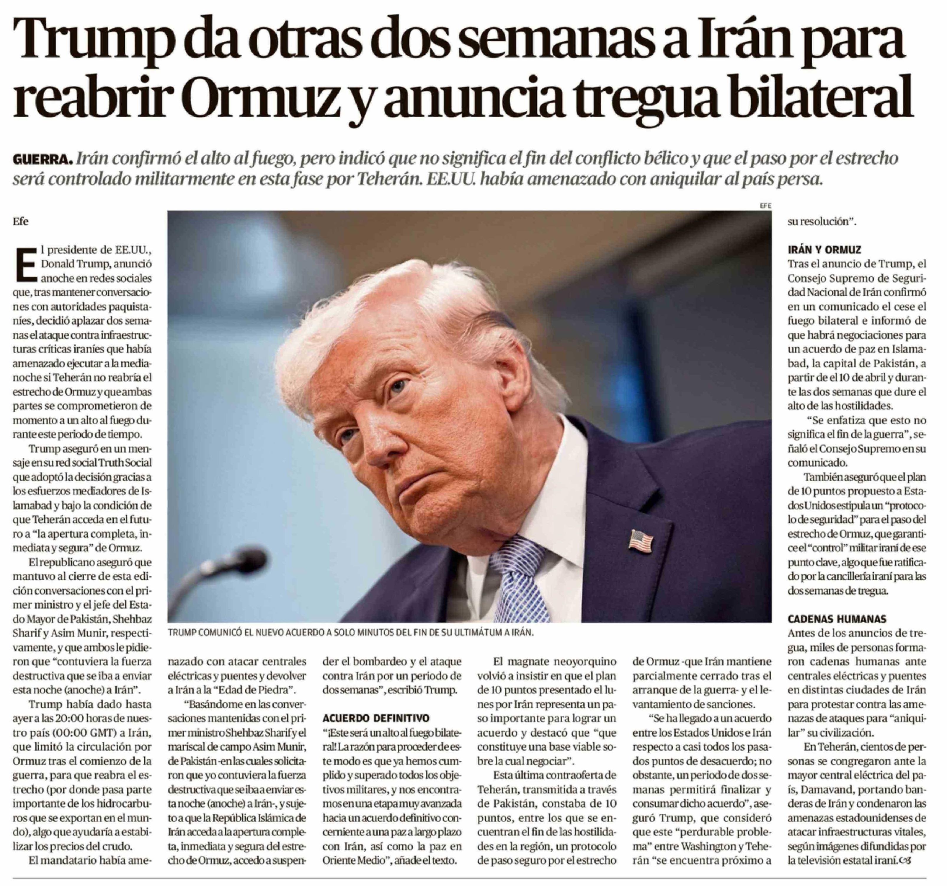 Trump da otras dos semanas a Iran para reabrir Ormuz y anuncia tregua bilateral