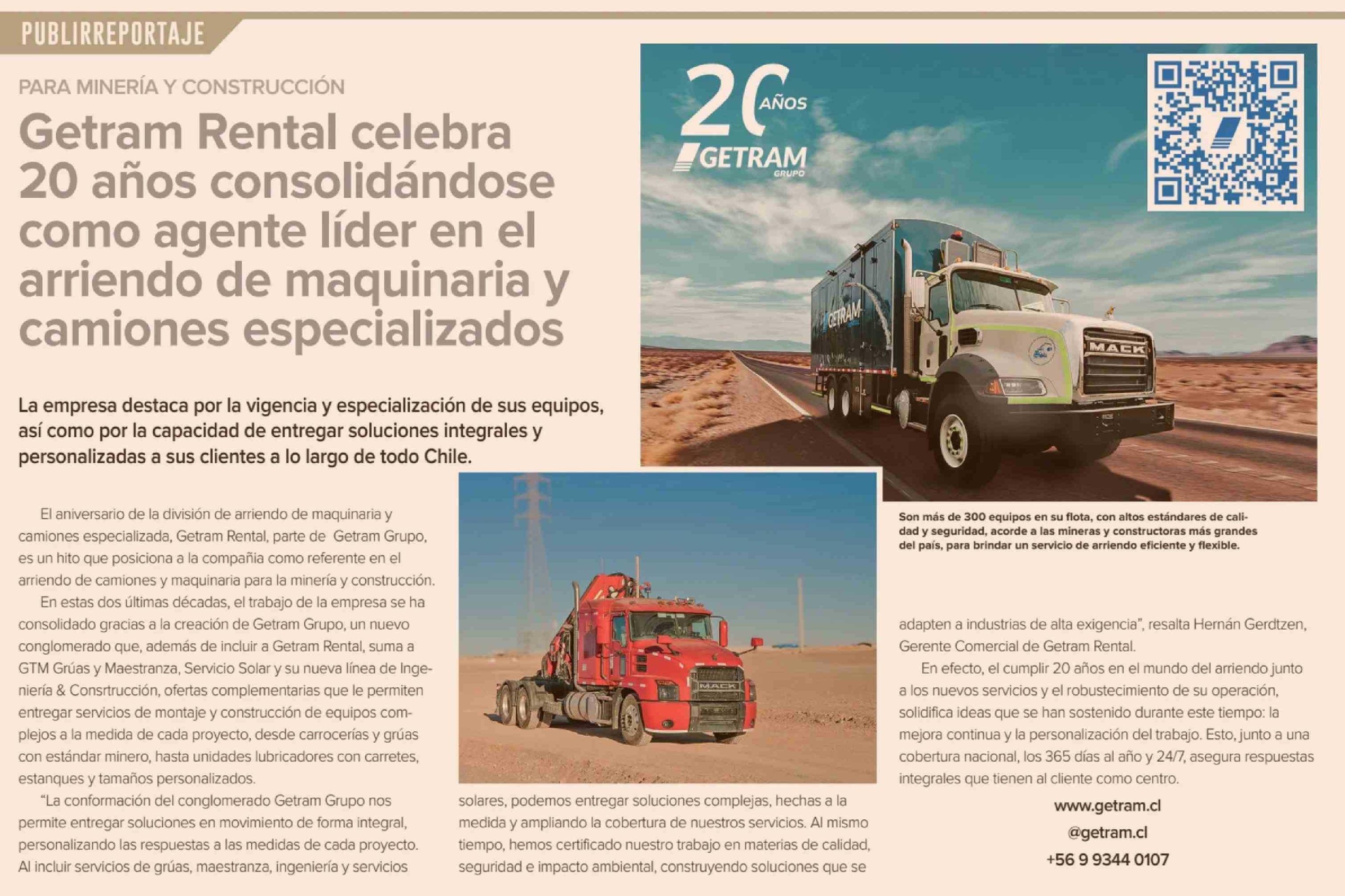 Getram Rental celebra 20 años consolidándose como agente líder en el arriendo de maquinaria y camiones especializados