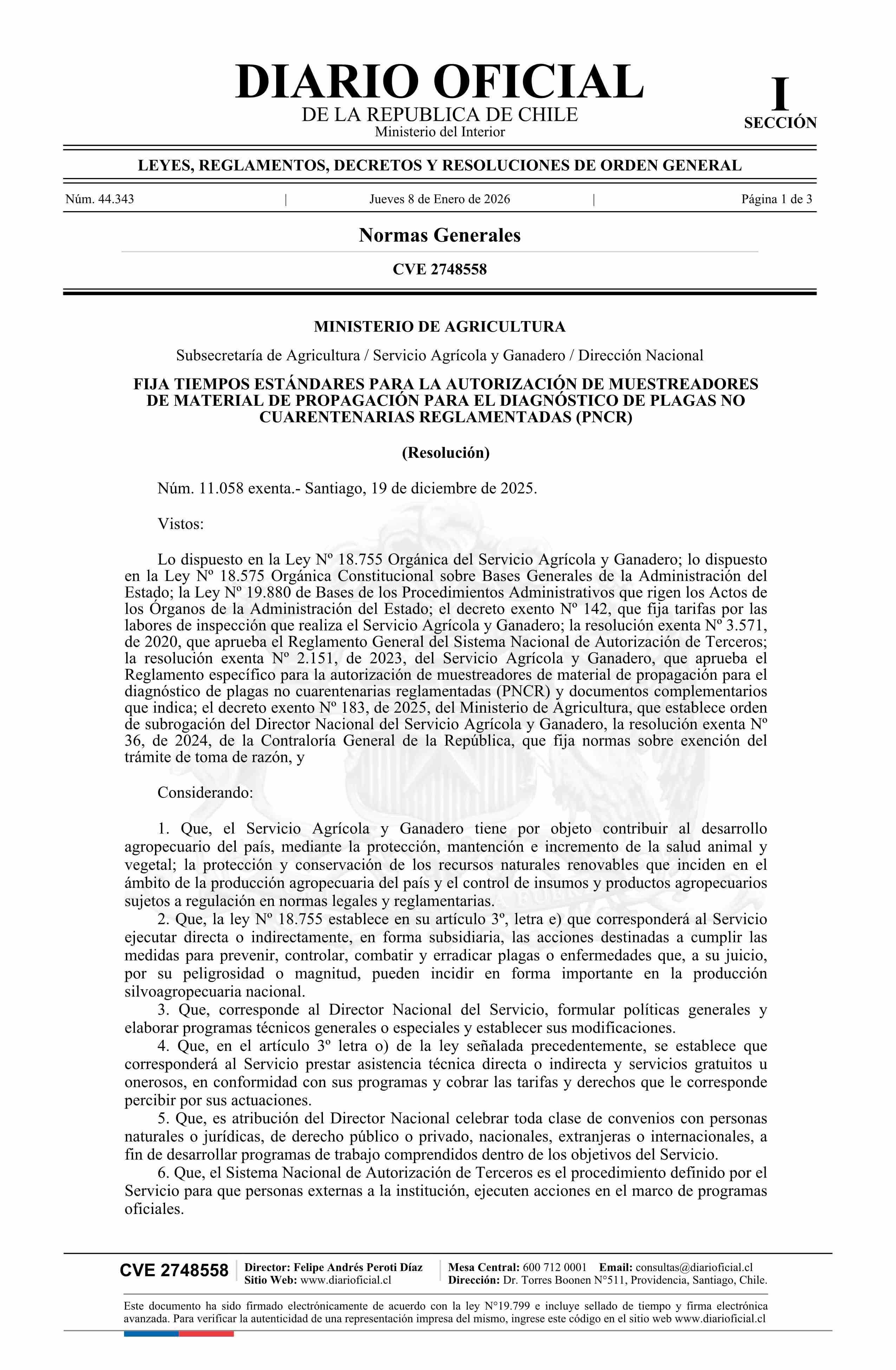 | Título: | Resolución exenta número 11.058, de 2025.- Fija tiempos estándares para la autorización de muestreadores de material de propagación para el diagnóstico de plagas no cuarentenarias reglamentadas (PNCR) |