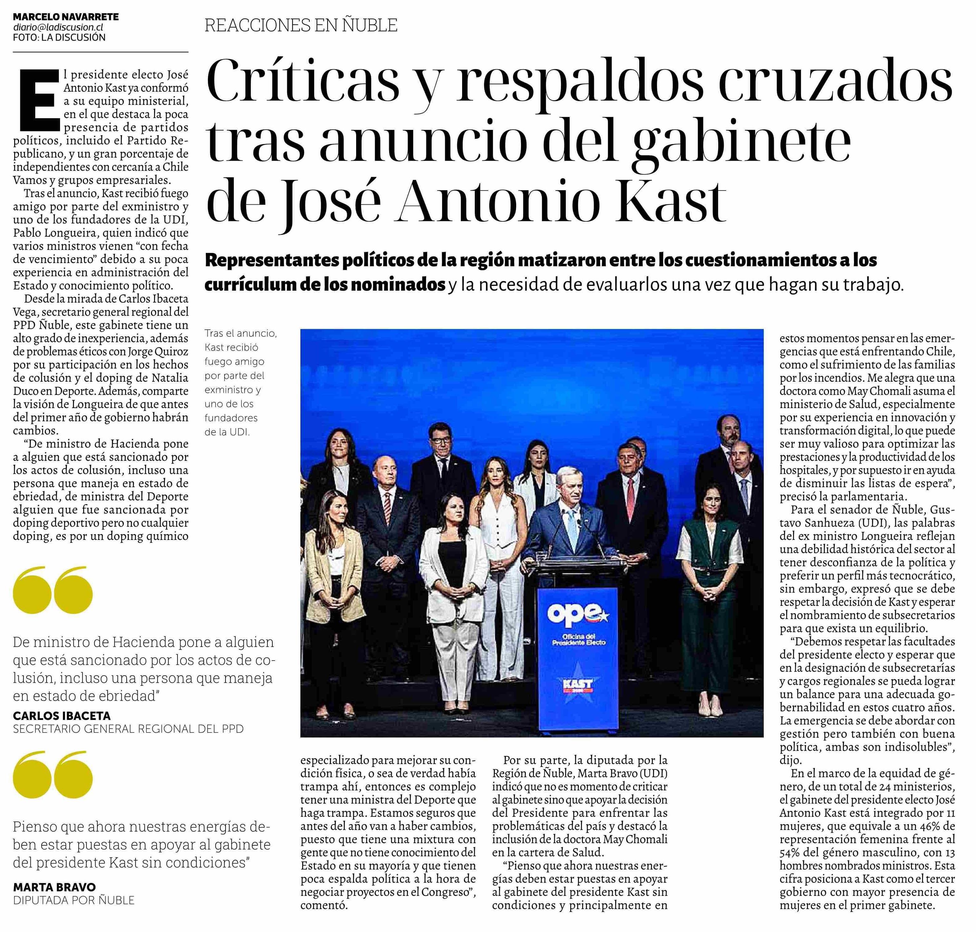 Críticas y respaldos cruzados tras anuncio del gabinete de José Antonio Kast