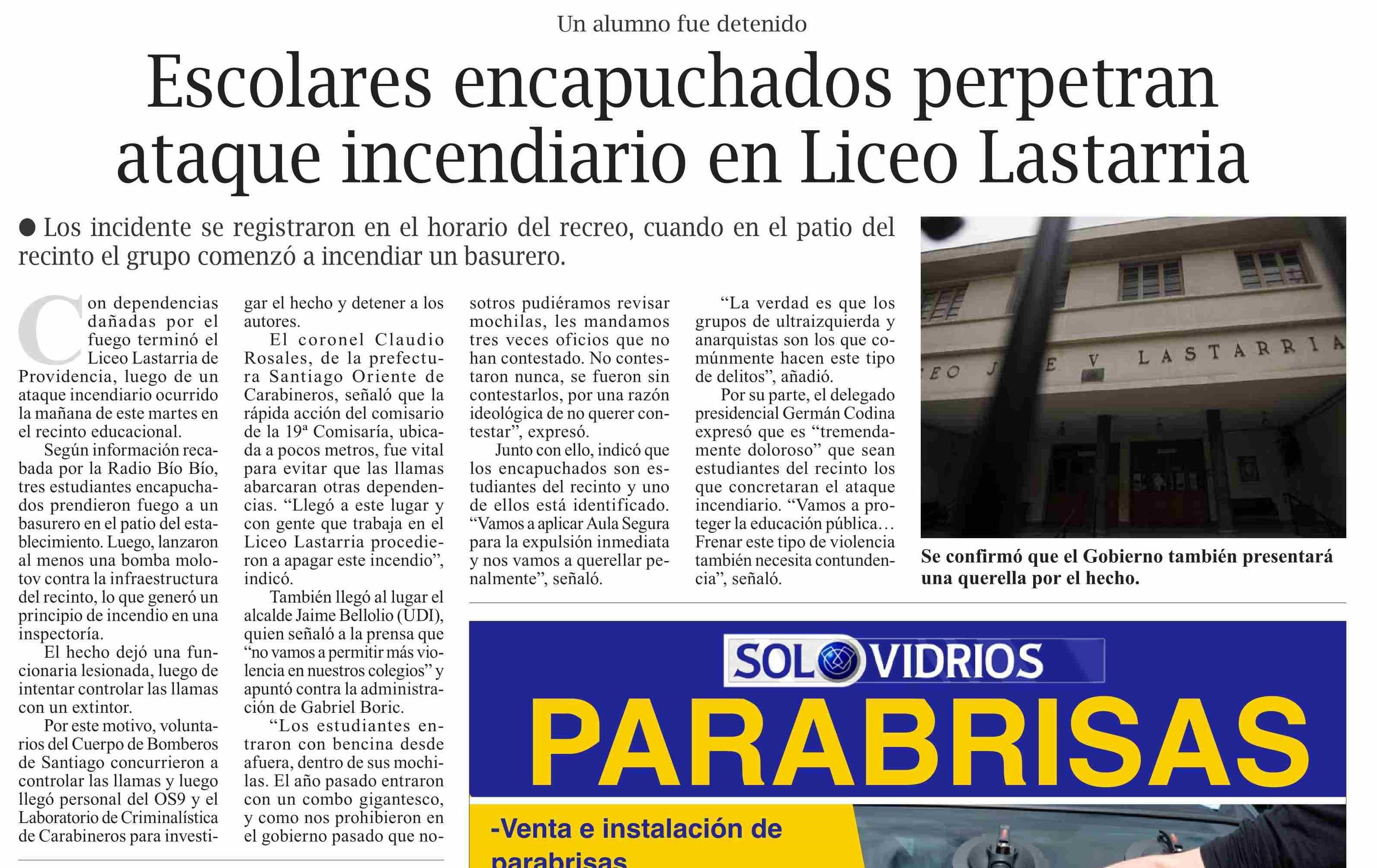 Escolares encapuchados perpetran ataque incendiario en Liceo Lastarria