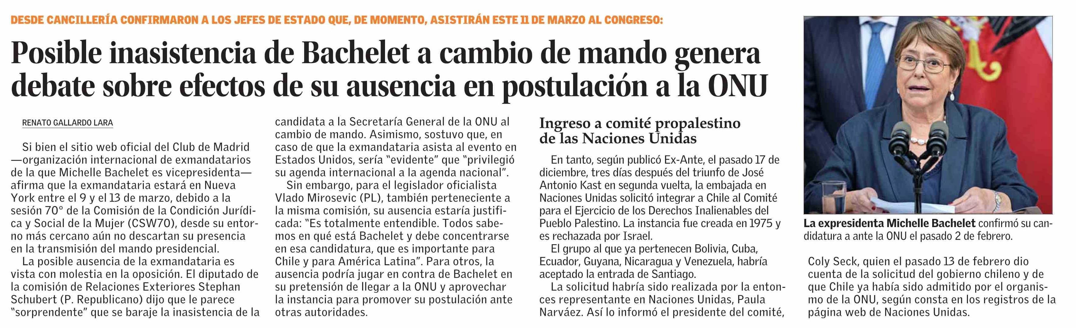 Posible inasistencia de Bachelet a cambio de mando genera debate sobre efectos de su ausencia en postulación a la ONU