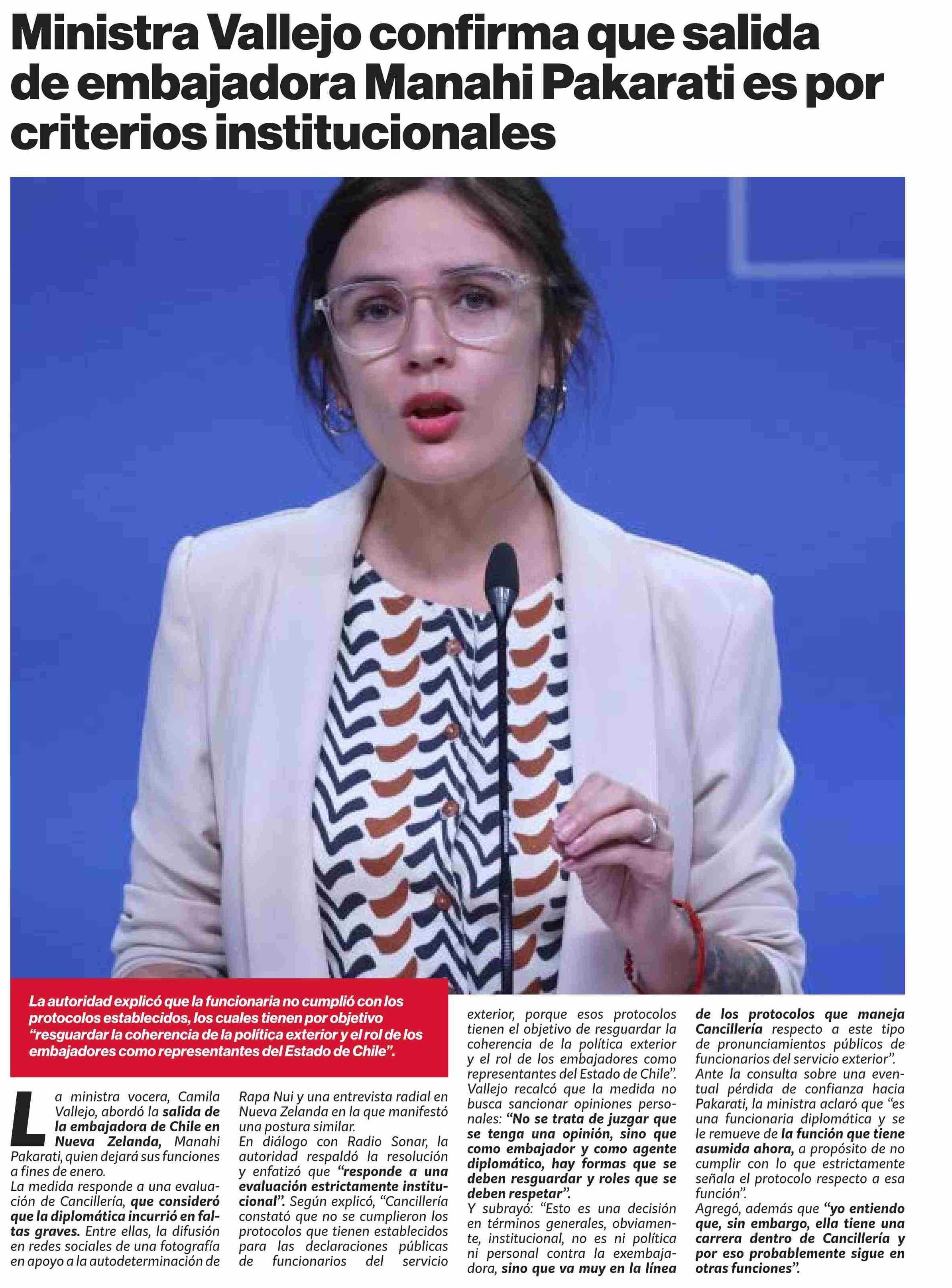 Ministra Vallejo confirma que salida de embajadora Manahi Pakarati es por criterios institucionales