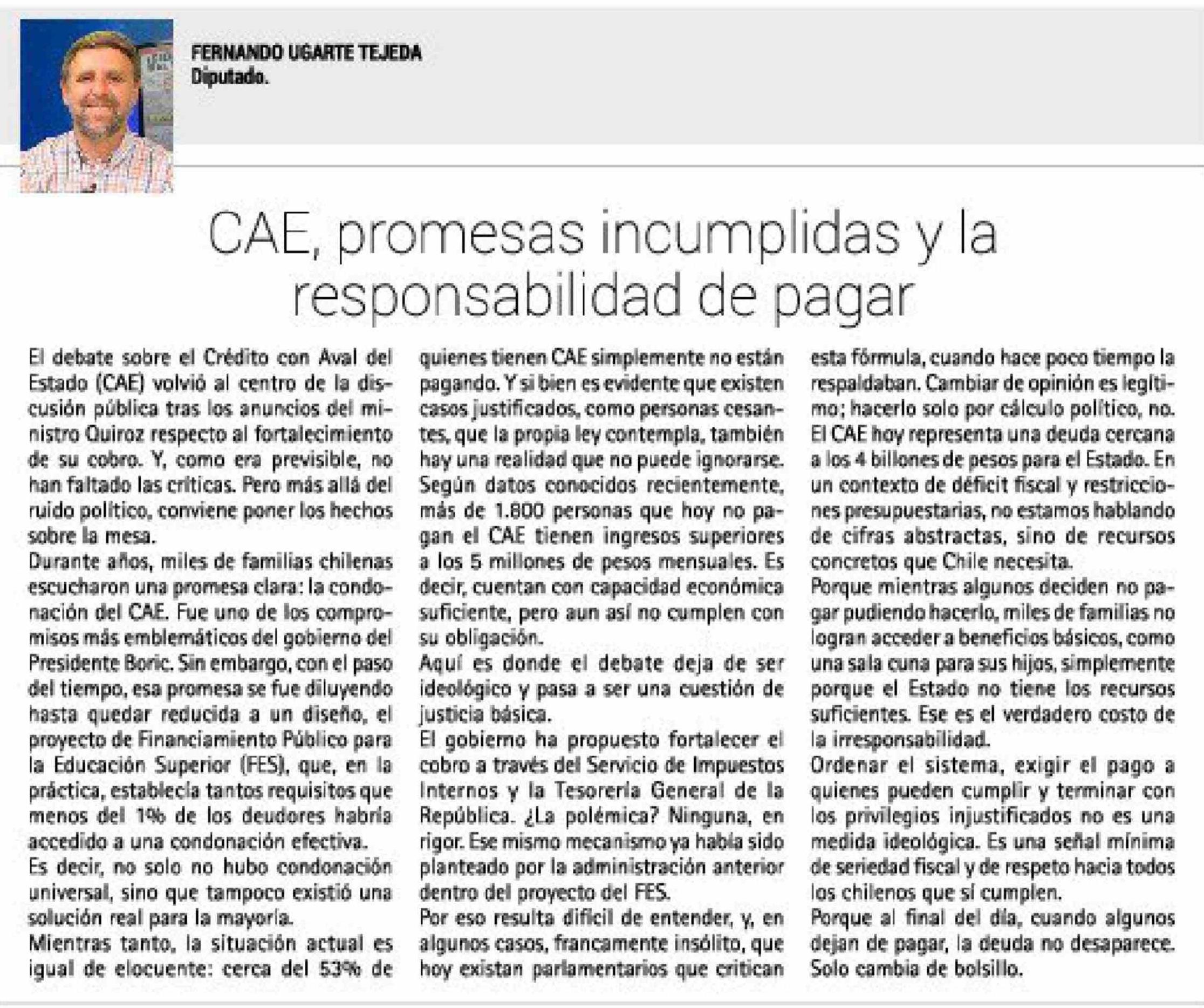 Título: Columnas de Opinión: CAE, promesas incumplidas y la responsabilidad de pagar