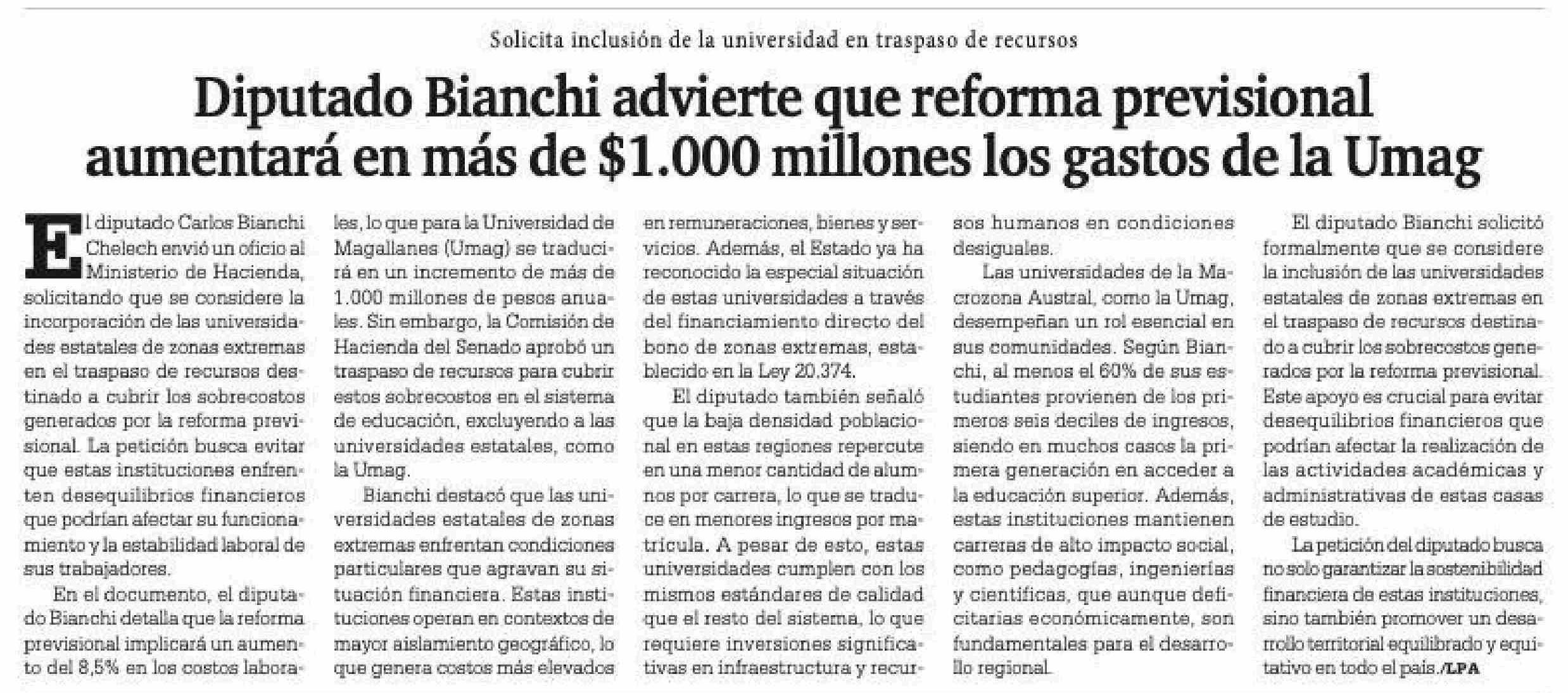 Diputado Bianchi advierte que reforma previsional aumentará en más de $1.000 millones los gastos de la Umag