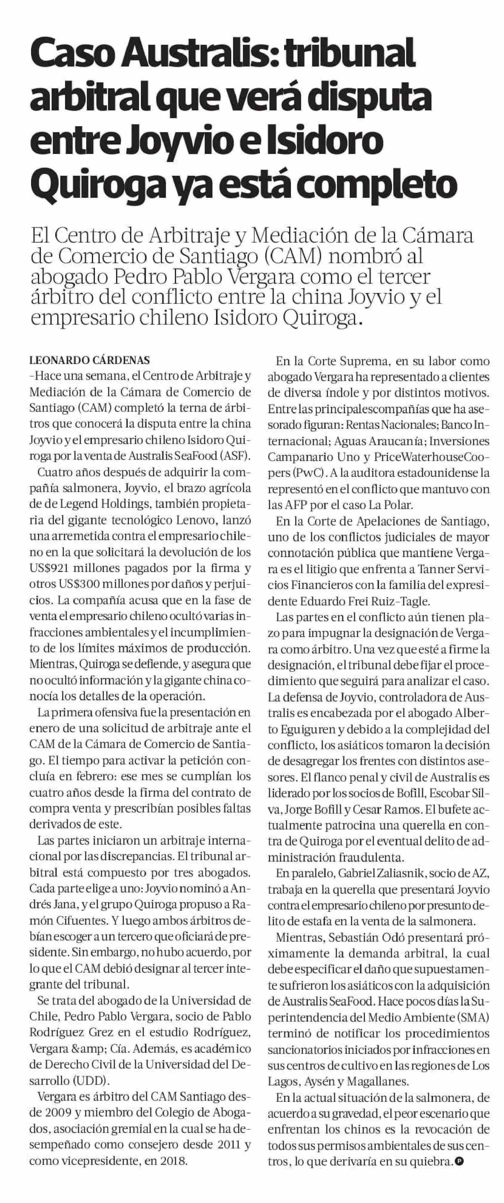 Caso Australis: tribunal arbitral que verá disputa entre Joyvio e Isidoro Quiroga ya está completo