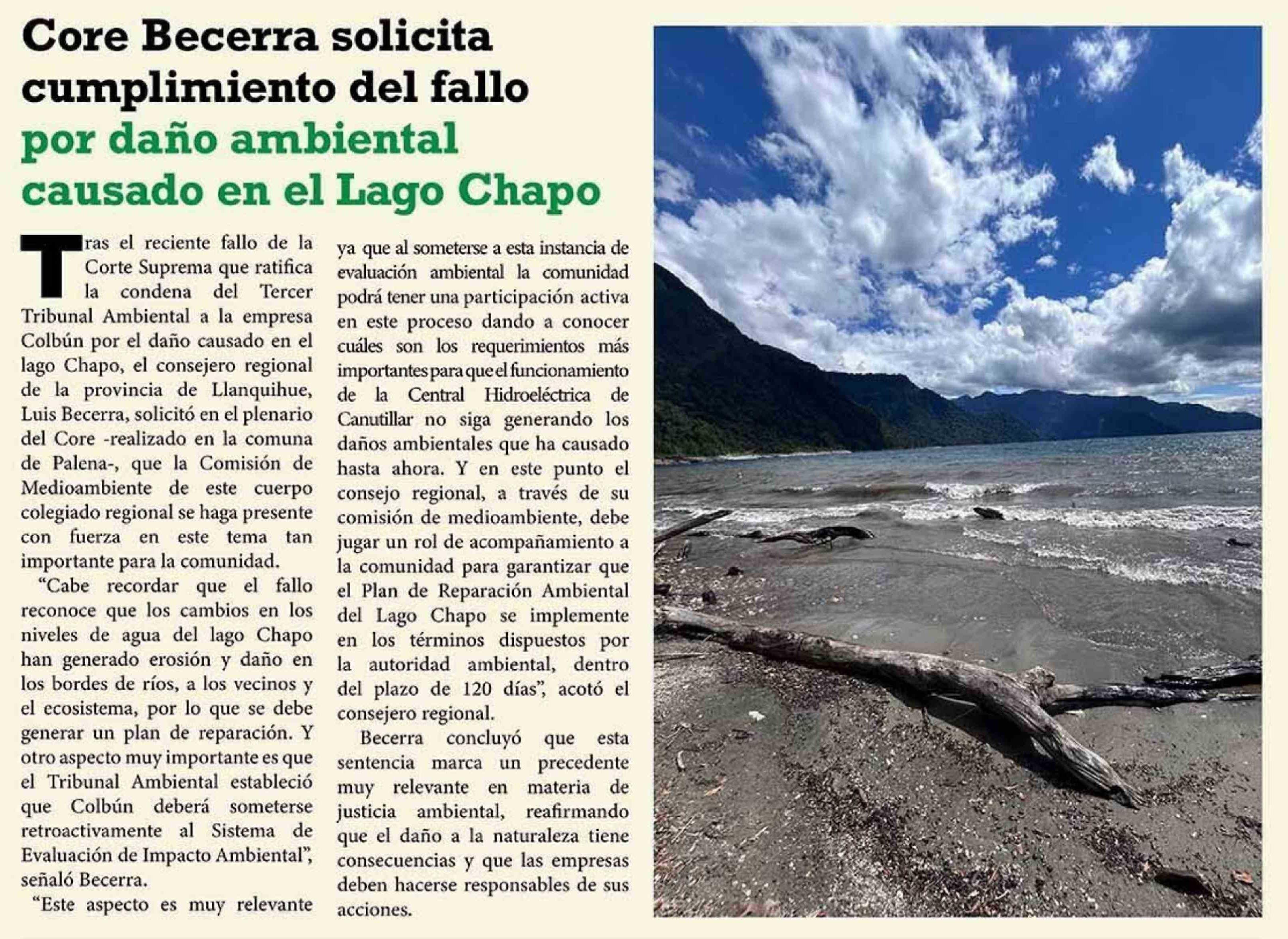 Core Becerra solicita cumplimiento del fallo por daño ambiental causado en el Lago Chapo
