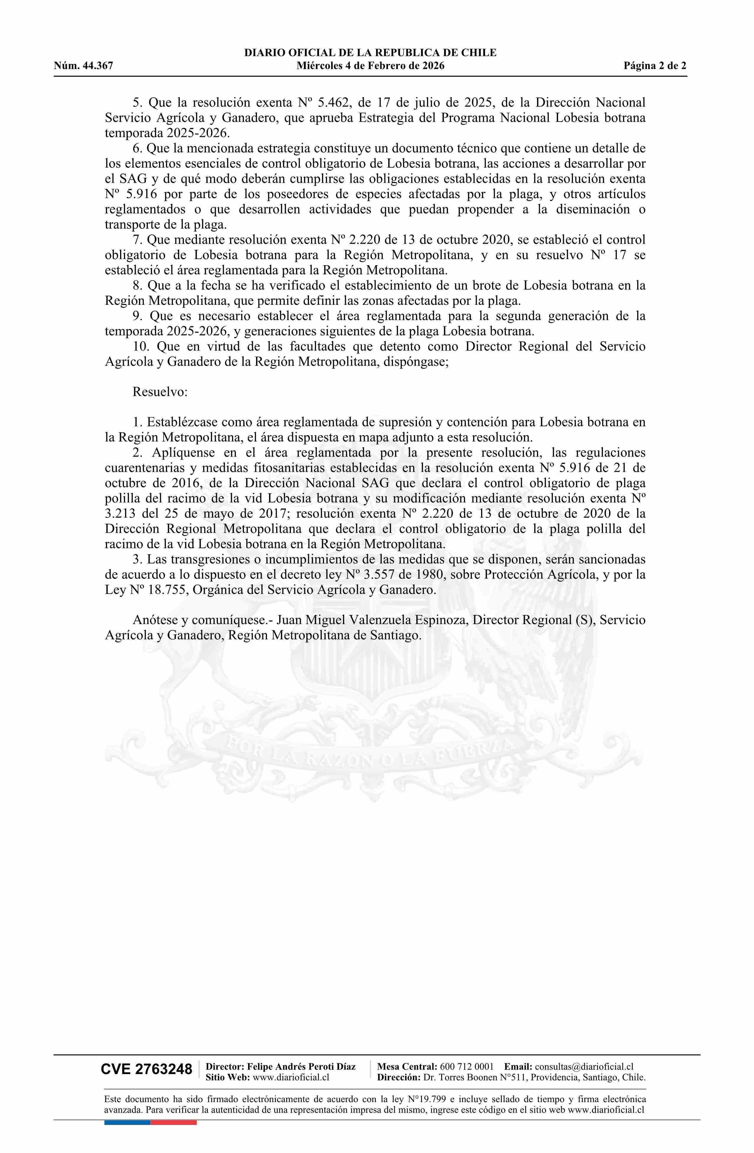 | Título: | Resolución exenta número 232, de 2026.- Establece área reglamentada por Polilla del racimo de la vid (Lobesia botrana) en la Región Metropolitana para la segunda generación de la temporada 2025-2026 |