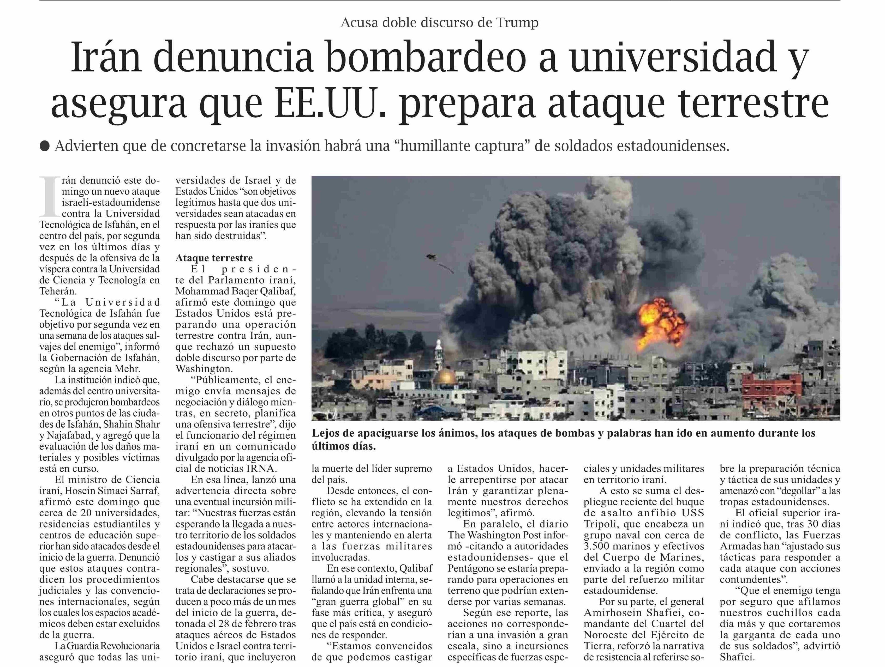 Título: Irán denuncia bombardeo a universidad y asegura que EE.UU. prepara ataque terrestre