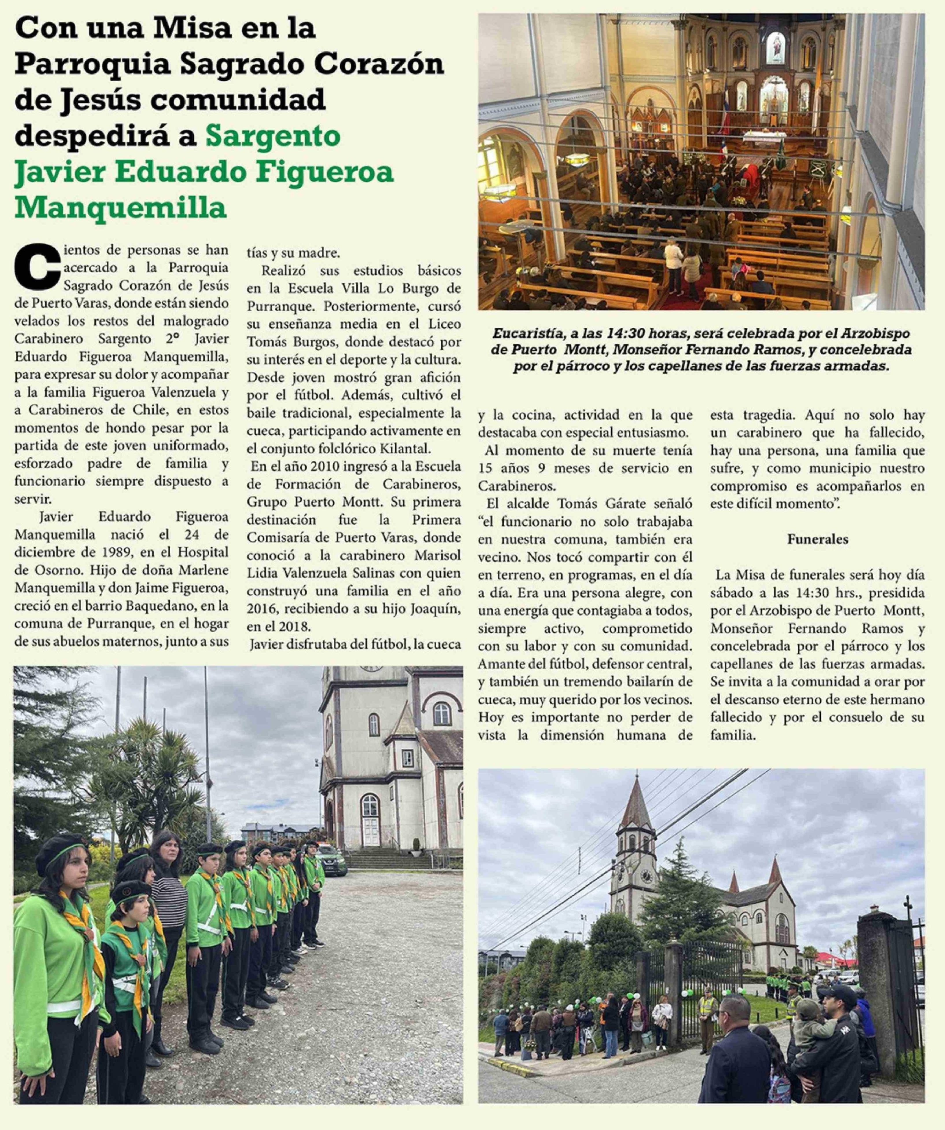 Con una Misa en la Parroquia Sagrado Corazón de Jesús comunidad despedirá a Sargento Javier Eduardo Figueroa Manquemilla