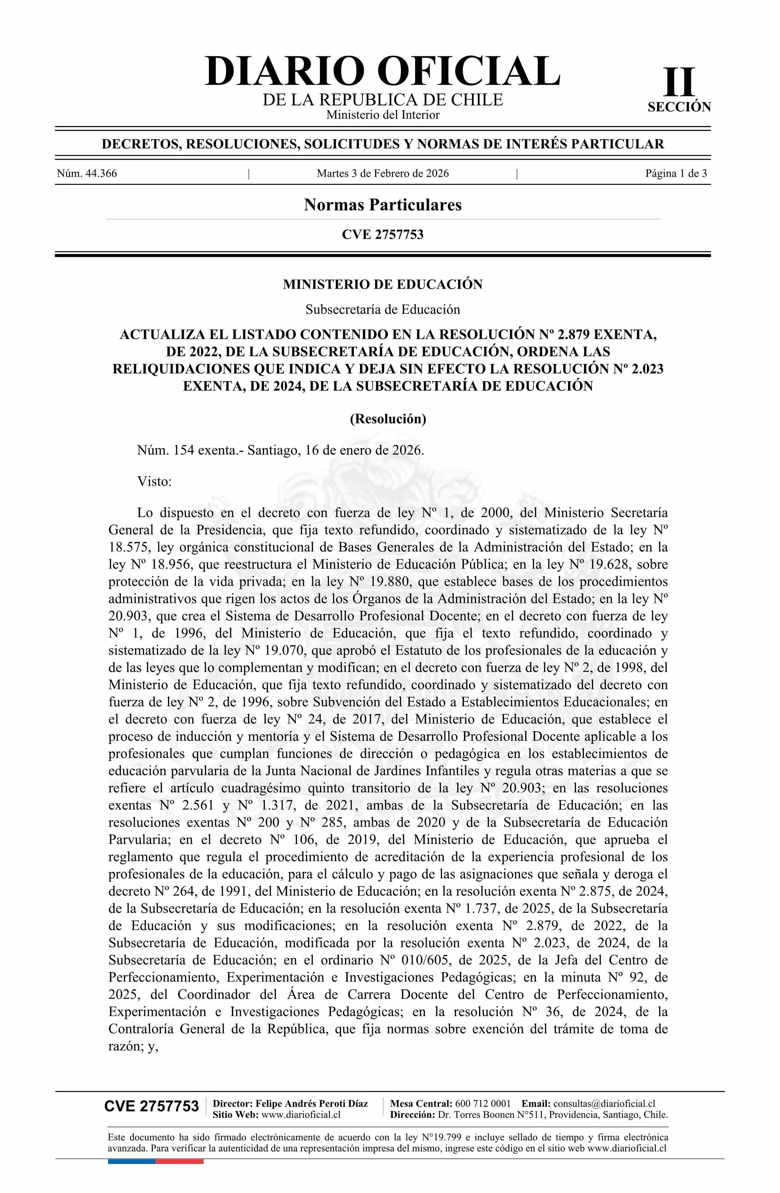 | Título: | Resolución exenta número 154, de 2026.- Actualiza listado contenido en la resolución Nº 2.879 exenta, de 2022, ordenando las reliquidaciones que indica y deja sin efecto la resolución Nº 2.023 exenta, de 2024 |