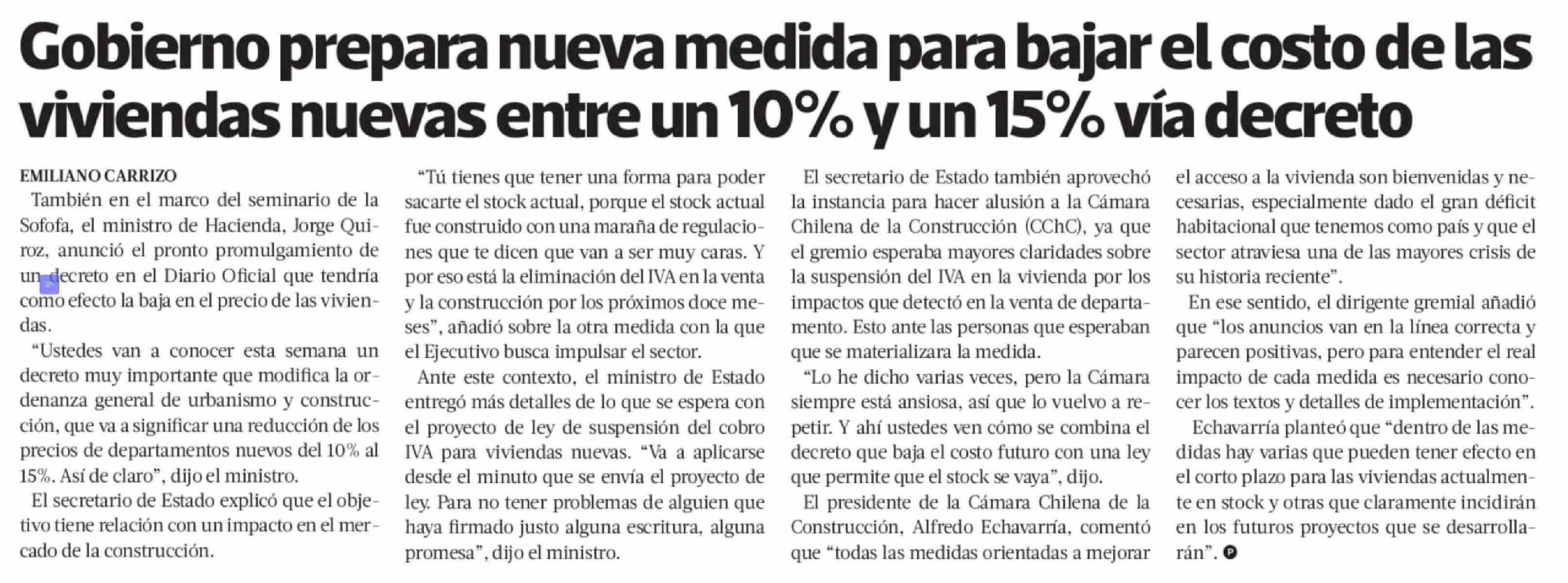 Gobierno prepara nueva medida para bajar el costo de las viviendas nuevas entre un 10% y un 15% vía decreto