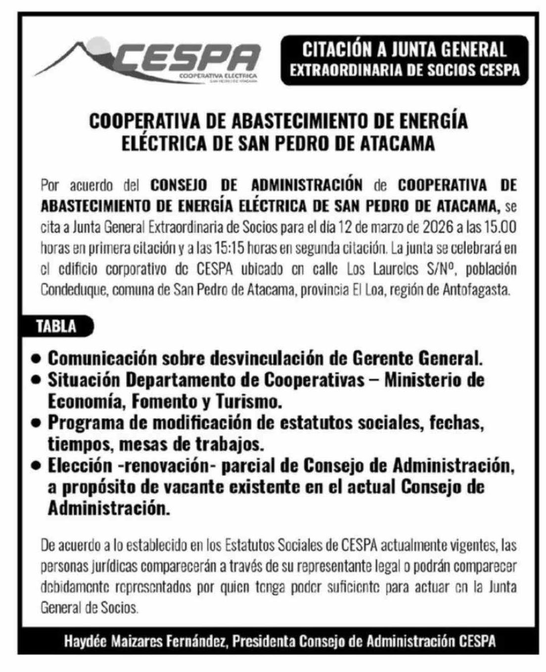 EXTRACTOS: COOPERATIVA DE ABASTECIMIENTO DE ENERGÍA ELÉCTRICA DE SAN PEDRO DE ATACAMA