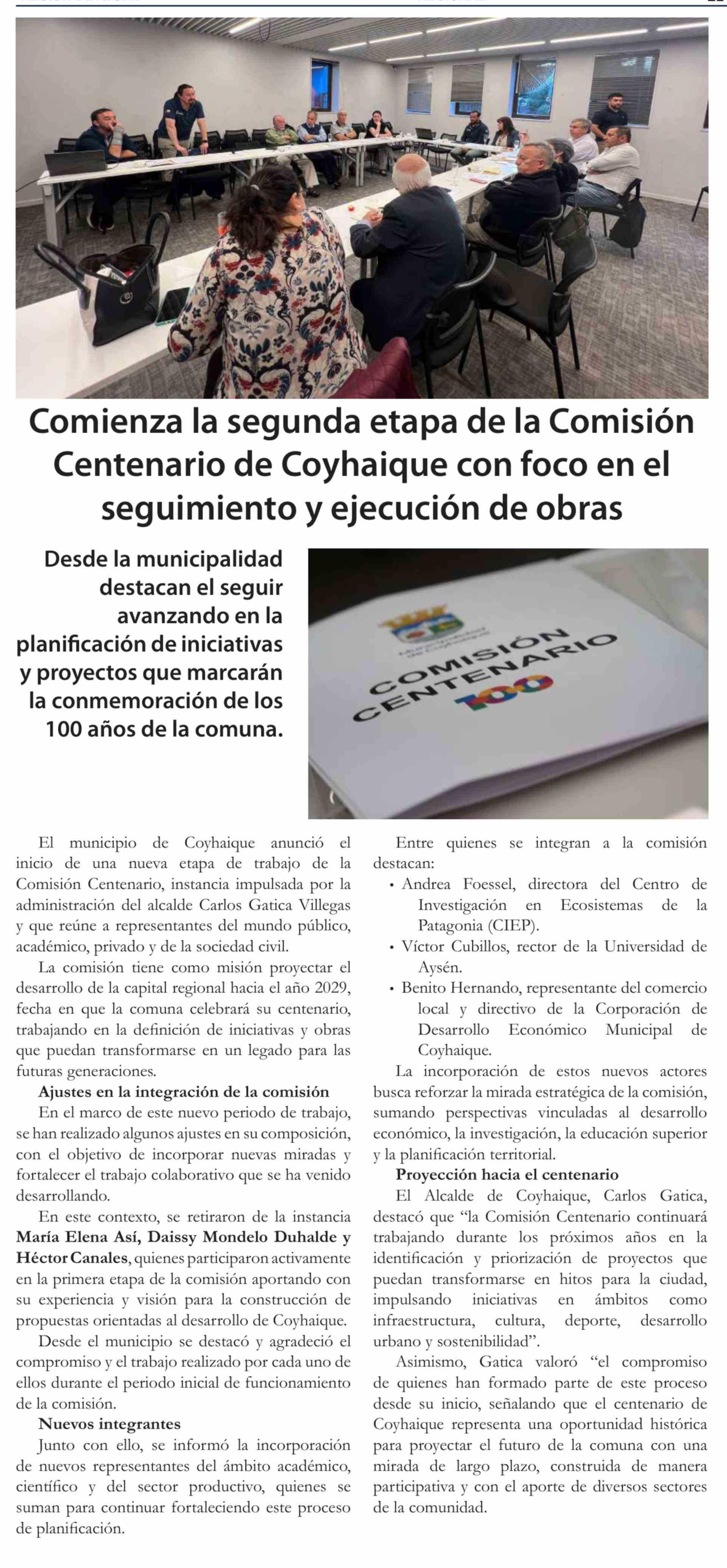 Comienza la segunda etapa de la Comisión Centenario de Coyhaique con foco en el seguimiento y ejecución de obras
